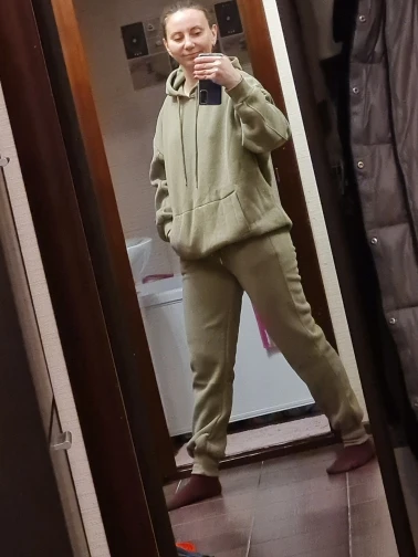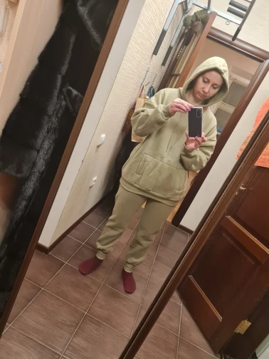Костюмом довольна. Заказывала размер М. Ношу М. Всё село хорошо. Штаны идеально и по длине и по фигуре. Кофта прям мешковатая, но я так понимаю, оно так и должно быть. Вообщем мне нравится. Качество хорошее. Как после стирки себя поведёт, не знаю. Он очень тёплый. Походила минут 10 в доме в нём и стало очень жарко. Цвет такой, как заказывала. Спасибо за подарок, очень приятно ❤️