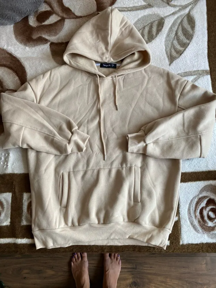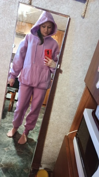 Отличный костюм, тёплый, мягкий, нитки ни где не торчат, сшит качественно. На мой 44-46 рост 170 - М сел хорошо (спасибо отзывам). Кофта оверсайз, капюшон большой.