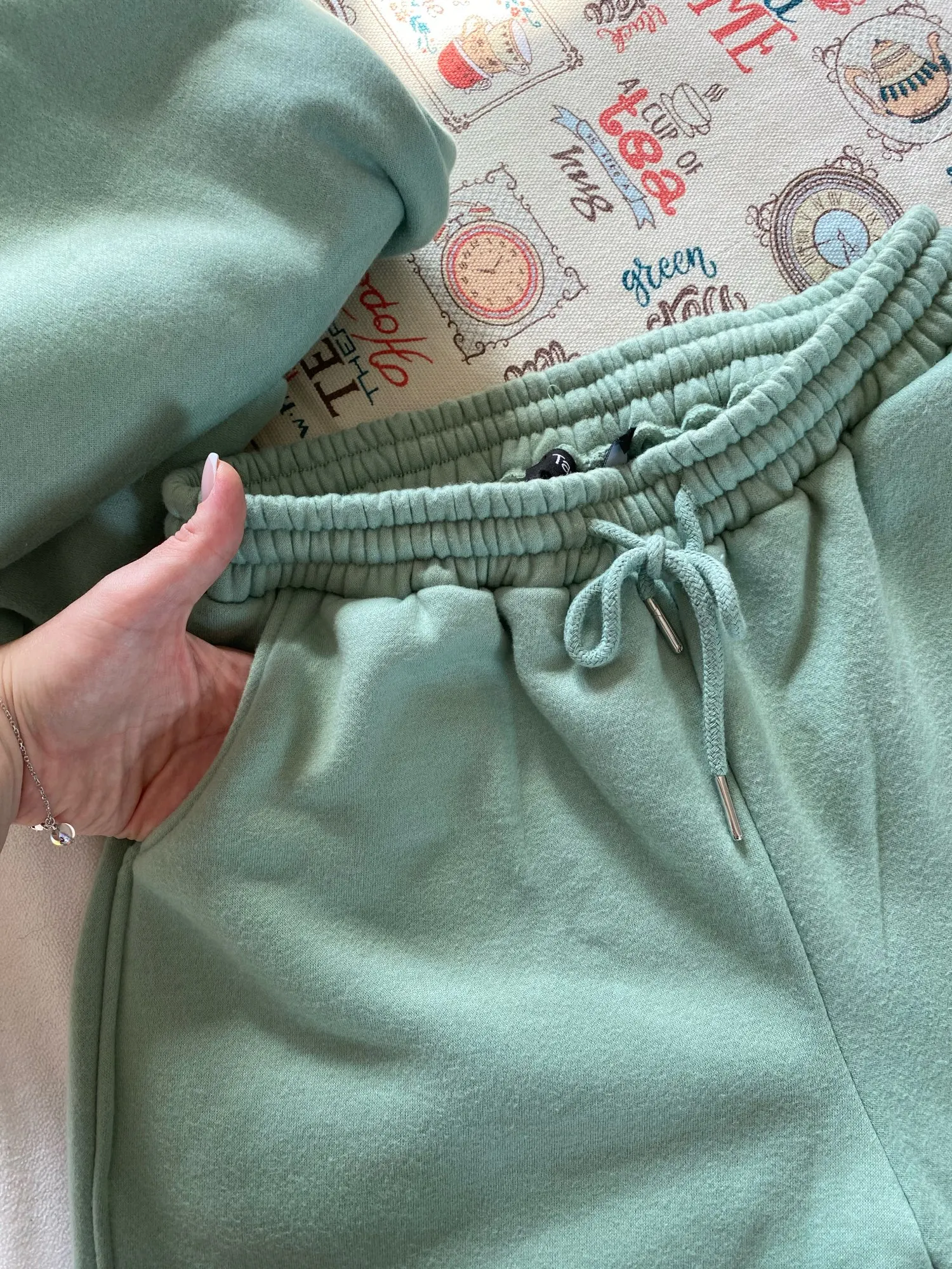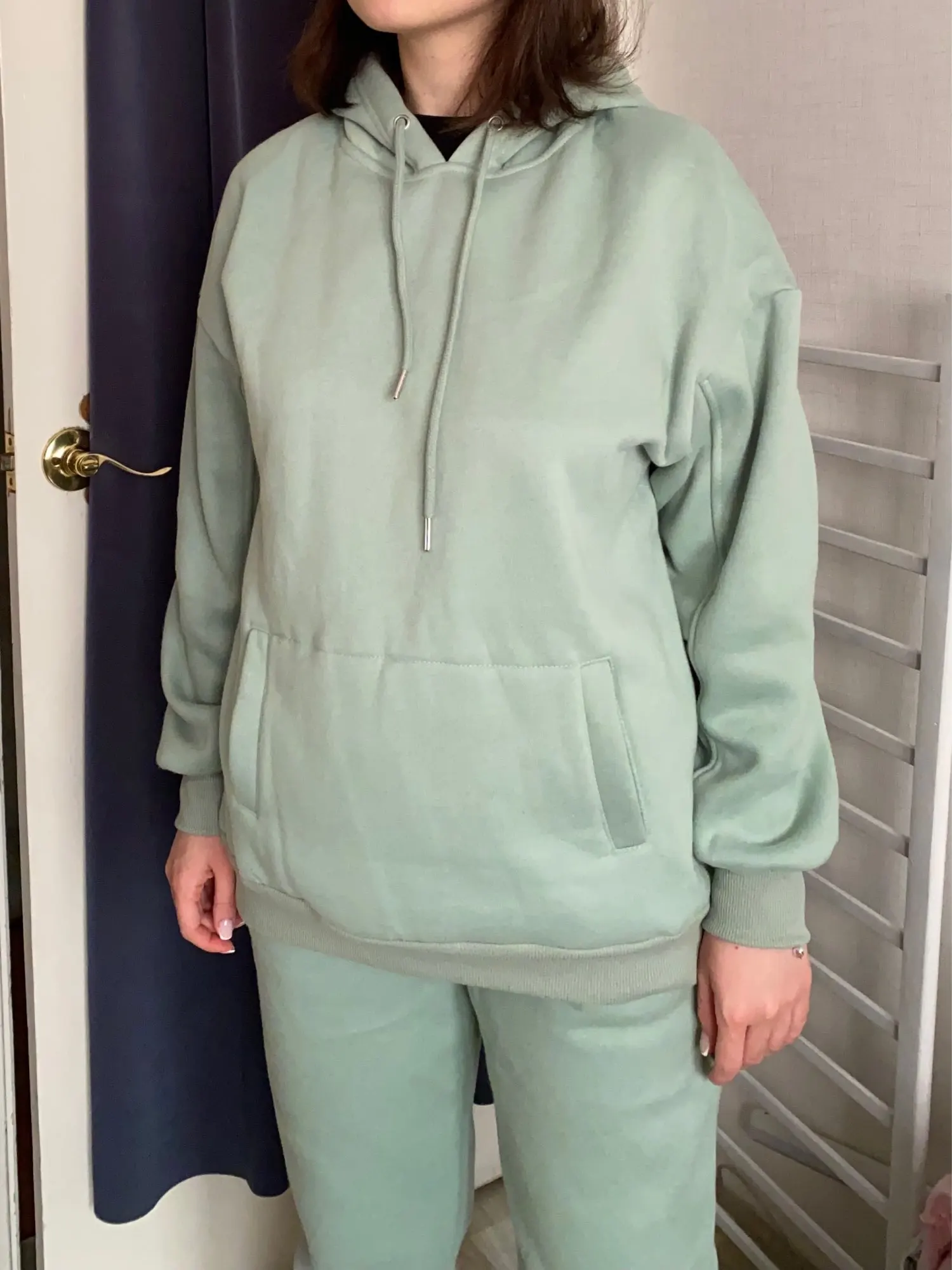 Пришёл мой костюм мятного цвета. Шёл до МО на 5post около трёх недель. Из плюсов материал хороший, чувствуется , что хлопка в составе больше , начес имеется небольшой из флиса, цвет такой же как на фото. Из минусов костюм тонковат, я заказывала 5 костюмов таких же состоящих из джогеров и худи у магазина toppies , у них очень плотная ткань , даже капюшон настолько тёплый что можно зимой вместо шапки носить , плотнее и флис с внутренней стороны , но возможно это даже не минус этого костюма , буду носить весной , летом прохладными вечерами) ну и цвет конечно мне очень нравится) так что могу сказать что я очень довольна приобретением. На параметры : ОГ 90 ОТ 76 ОБ 104 подошёл размер L , на рост 163 штаны можно было бы даже размера М заказать) в общем костюм в любом случае рекомендую но учитывайте , что могло бы быть и потолще)