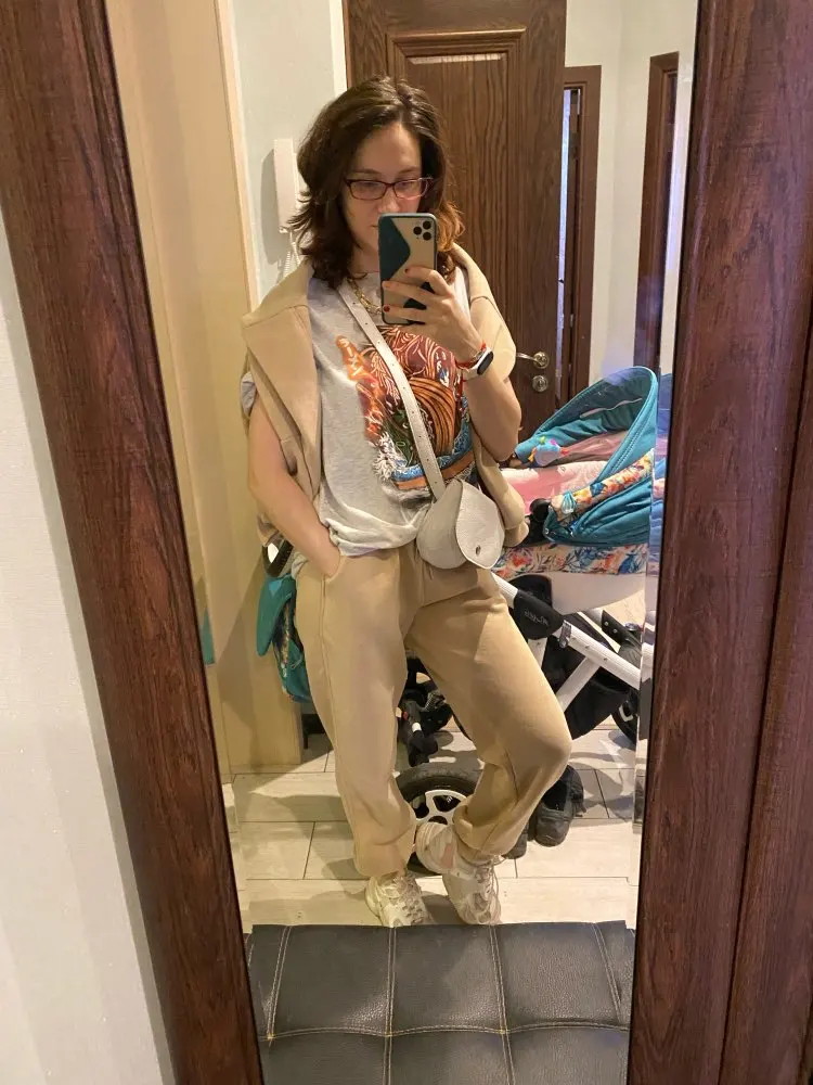 Костюм отличный, превзошёл все ожидания. Брала на 91 ОБ размер ХS - сел хорошо, больше и ненужно, эффект оверсайз есть. Берите размер в размер, ориентируясь на размерную сетку продавца, тк в размер уже заложен оверсайз. Качество порадовало, все швы ровные, карман с подкладкой, придраться не к чему. Если стирать на деликатной стирке - думаю долго прослужит, точно не хуже брендовых аналогов. Цвет хотелось бы немного понасыщеннее у болотного, но и в реале тоже неплохо. Советую от души этот костюм. Доставка была до Владимира 24 дня и то потому что наша таможня долго держала.