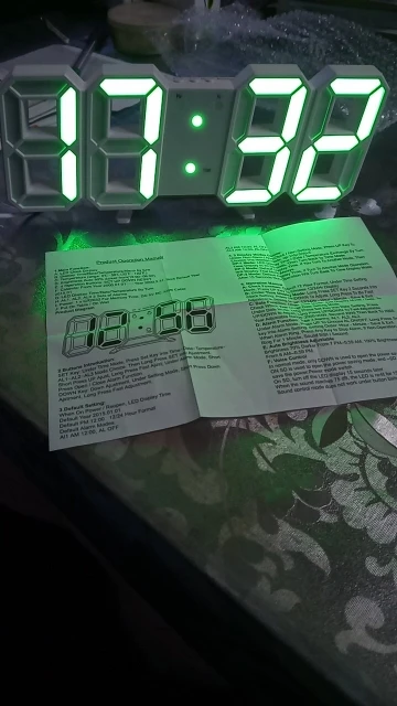 Отличные часы. Крупные цифры. При отключении электричества сохраняют время за счёт батарейки 3 Вольта. Есть режим показывают часы постоянно. Есть режим при хлопке включается дисплей и через 15 секунд гаснет. Инструкцию сфоткал на телефон и вставил в гуглперевожчик. Настраивается легко. На стену то, что надо. После 19:00 яркость 30%, а после 6:00 100%