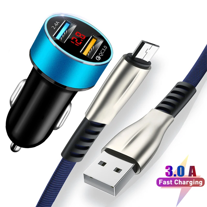 Автомобильное зарядное устройство со светодиодным дисплеем, автомобильное зарядное устройство с двумя USB-портами для OPPO A3 A3S A5 A5S Redmi 7 7A Note 5 6, кабель Micro USB для быстрой зарядки, 3 А