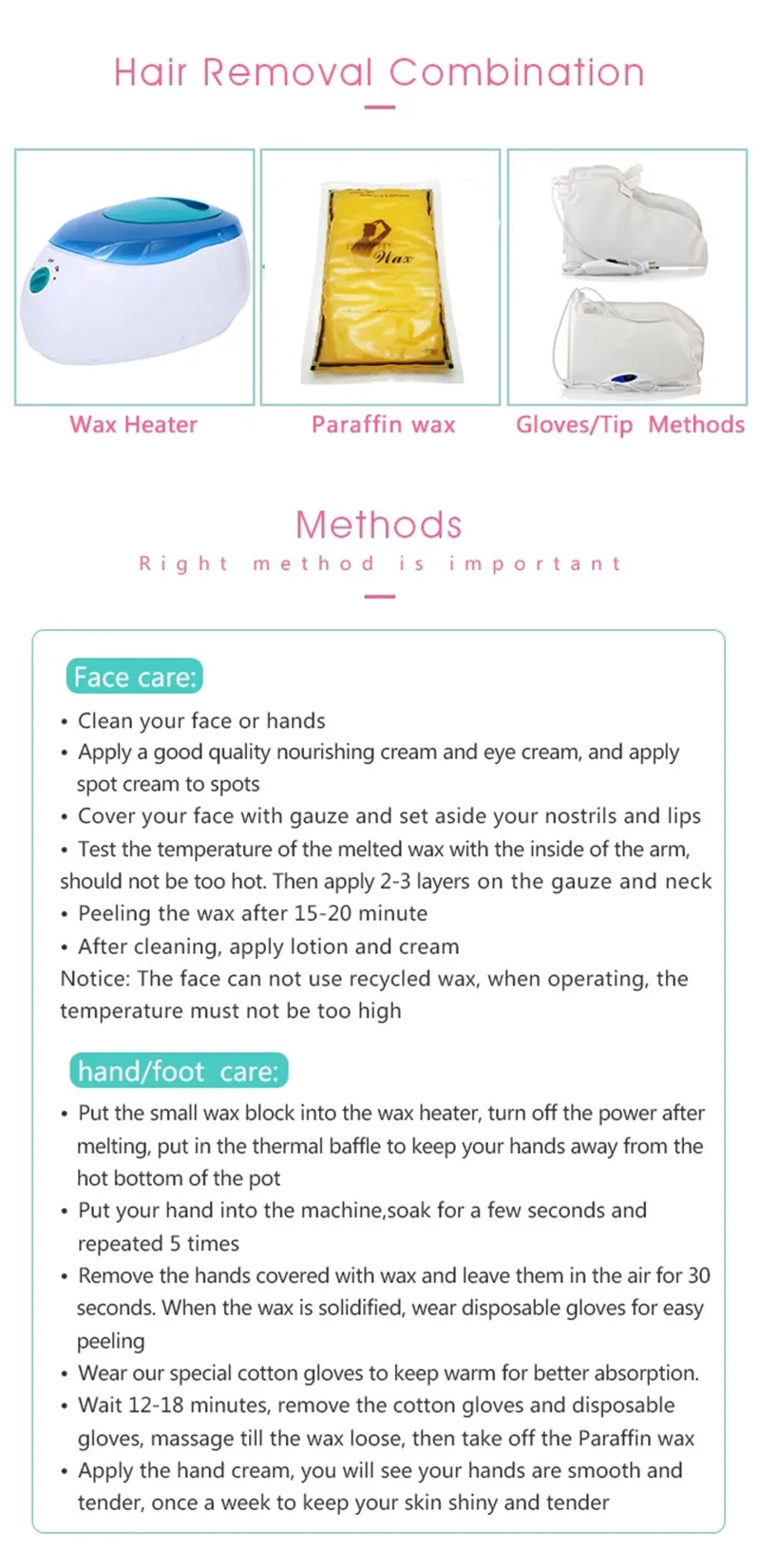Лечение парафина делает кожу мягкой и гладкой с ее выдающимся эффектом, особенно для сухой и грубой кожи зимой.Он может смягчить эпидермис и смягчить тонус, чтобы сделать кожу лица блестящей.Парафин может сделать кожу на руке мягкой.Благодаря простой эксплуатации и отличительному эффекту, воск красоты лечения id популярен в машине по всему миру.Смягчает кожу. Кожа больше не сухая и жесткая.После использования, уменьшая морщины, кожа становится нежной.Удаляет тусклые, сухие и омертвевшие клетки кожи.