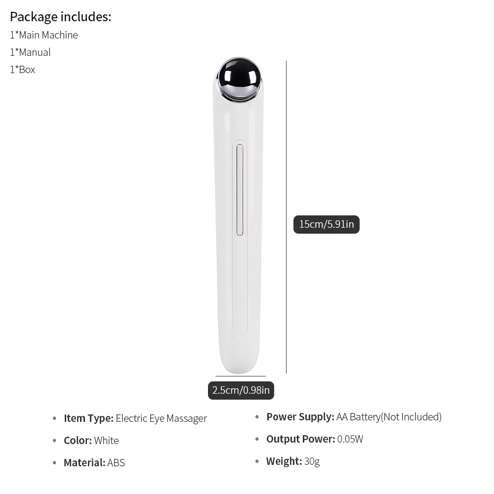 Тип изделия: Электрический массажер для глазЦвет: белыйМатериал: АБС-пластикИсточник питания: батарея AA (не входит в комплект)Выход Мощность: 0,05 WВес: 30 гРазмеры: 15*2,5 см/5,91 * 0.98in
