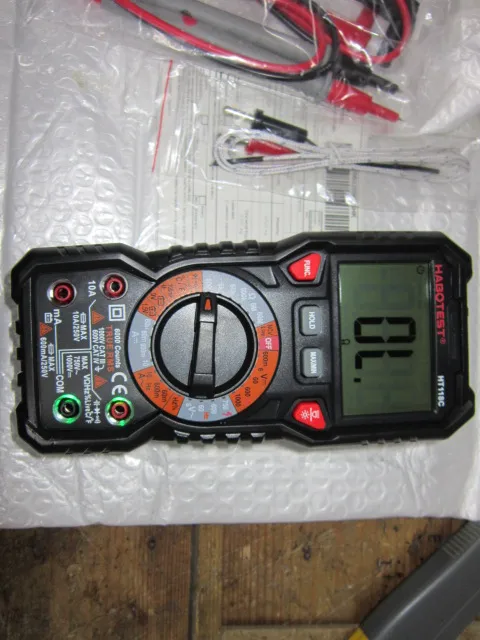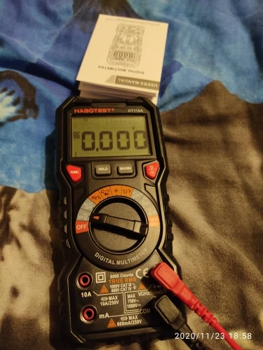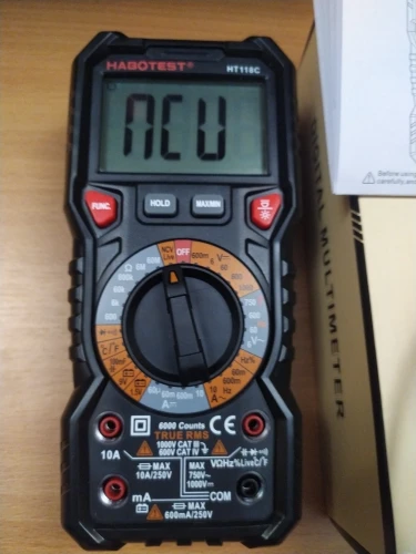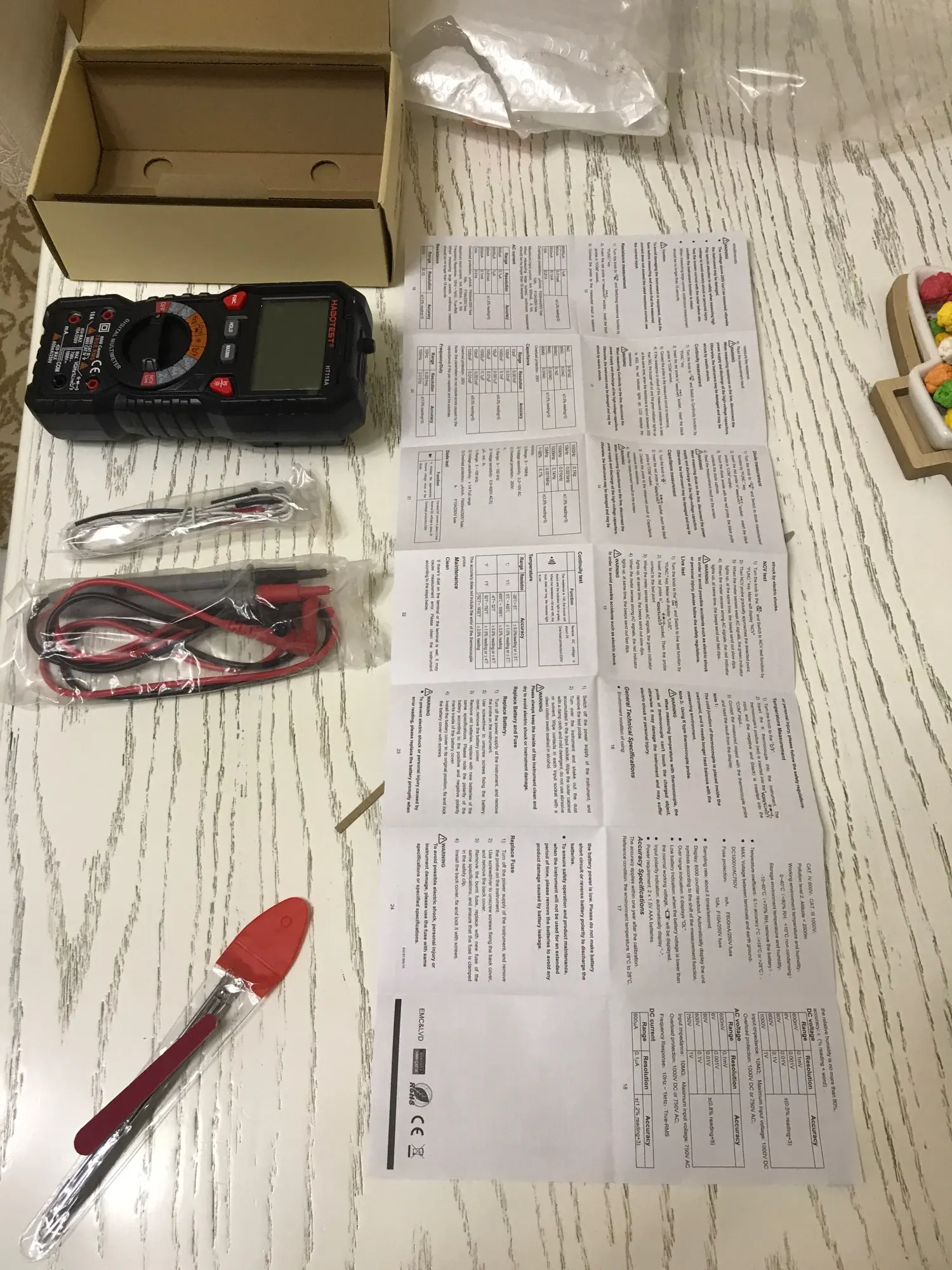Заказал за 1957 руб, доставка с момента оплаты 18 дней, в первый раз с Алиэкспресса так быстро пришла посылка, что очень порадовало. Комплектация соответствует описанию, сам мультиметр, щупы и термопара. Батареек в комплекте нет, нужно докупить батарейки типоразмера АА 2 шт. В описании по ошибке указан типоразмер ААА. Щупы наверное тоже куплю другие, у родных металлические наконечники слишком короткие, примерно 2-3 мм. Точность замерять особо нечем, на ютубе уже приведены довольно таки хорошие и подробные видеообзоры. Проверил протестировать светодиод, с этим справляется хорошо и успешно зажег его. NCV под гипсокартоном в принципе не плохо определяет проводку, под штукатуркой хреновастенько, показывает напряжение на слишком большой площади, точно не понять где именно проводка. Напряжение и емкость на батарейках показывает довольно таки точно. Прозвонка тоже на уровне. Термопарой можно пользоваться если только нужны примерные показания, но не более того. В общем прибор за такие деньги м