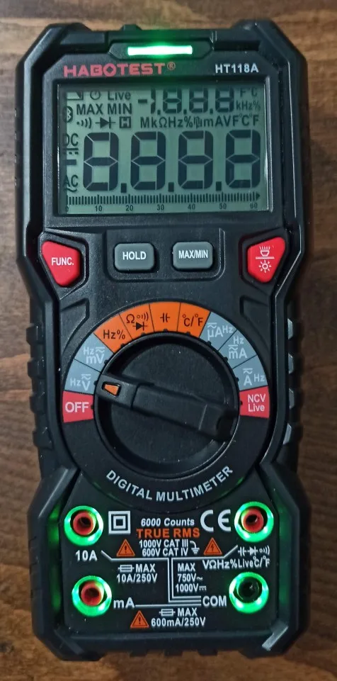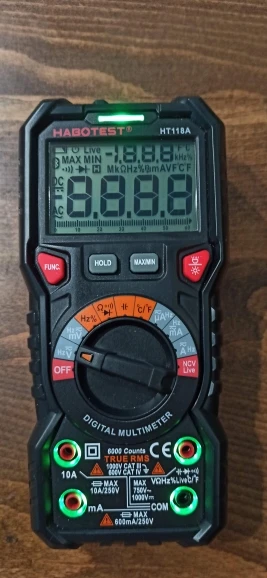 Тестер отличный, выглядит доброго, показывает достаточно точно, понравилась световая подсказка для установки зубов. После установки режима нужно нажимать кнопку function для выбора диапазона. Температуру и частоту измеряет, скрытую проводку показывает, хотя слишком чувствительно на мой взгляд, потестирую дополню отзыв. Подсветка экрана работает, цвет подсветки меняется на оранжевый поп опасном напряжении.