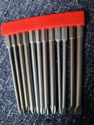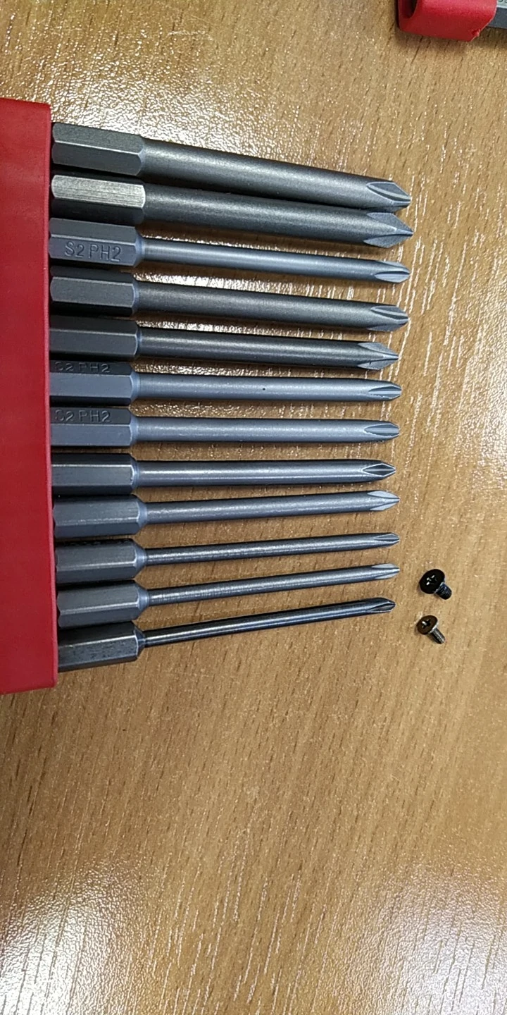Биты не все ровные. Но закалка хорошая, срезают шурупы, сами остаются целыми. Сталь хорошая, поэтому те что немного неровные выгнуть не выходит.