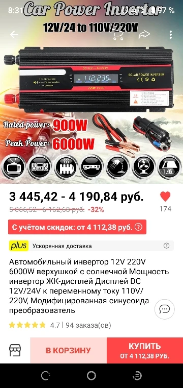 всем добрый день, инвертор оказался меньше чем на фото, обозначения 900w нету. при включении кулер не работает с права индикатор напряжения, изредка моргает. тянет телевизор на 40 w, при включении холодильника или маленькой болгарки начинает пищать. на вид маленький при такой заявленной мощности. протестирую дополню отзыв, но пятой точкой чувствую что не больше 150w.