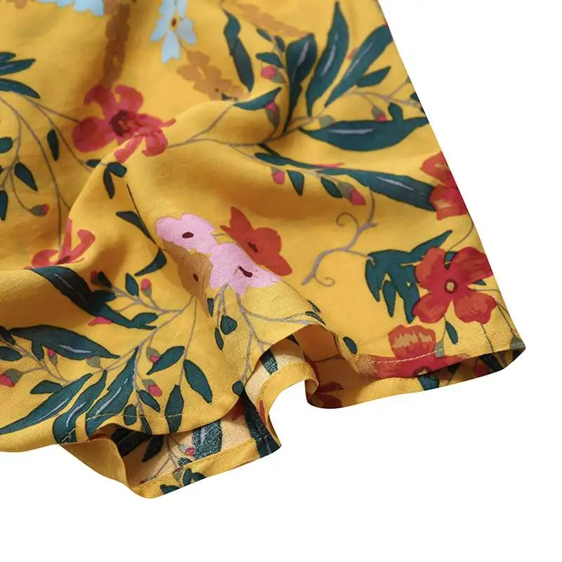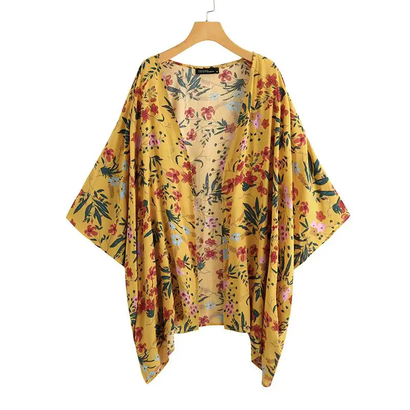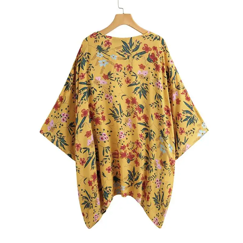 Посылка входит: 1 кардиганМатериал: 100% искусственный шелкЦвета: черный, белый, желтыйДлина рукава: рукав три четвертиУзор: цветочный принтТолщина: тонкаяОсобенности: неровный подолСтиль: Отдых, ЕвропаСезон: летоПовод: семья вечерние, пляж, праздник