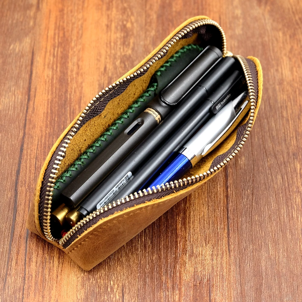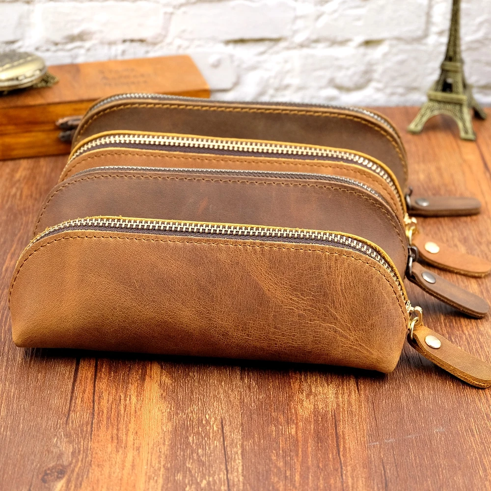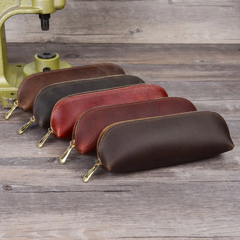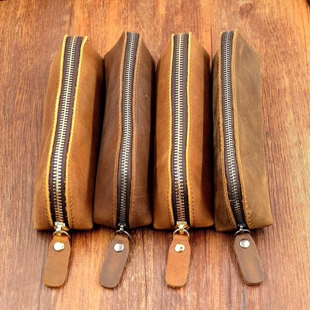Ретро-сумка для ручек из натуральной кожи, вместительный чехол-карандаш из воловьей кожи на молнии, держатель для очков, чехол из натуральной воловьей кожи ручной работы