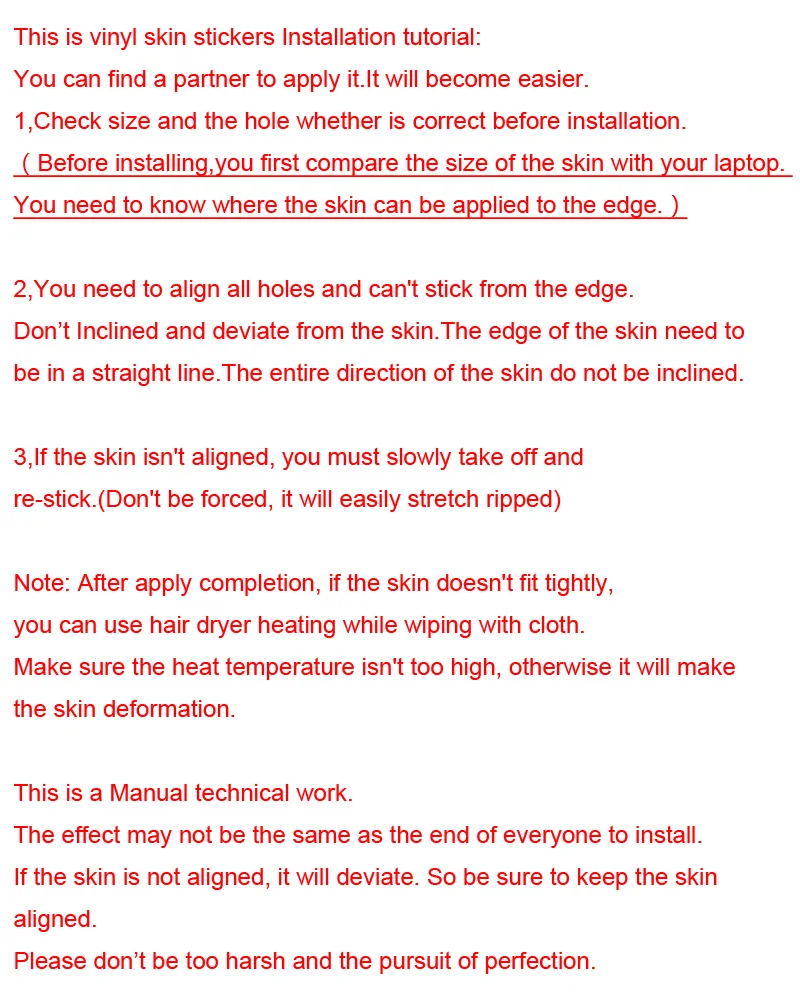 Примечание:Кожа может производить морщины при транспортировке, ее трудно избежать. Но это не повлияет на установку. Потому что кожа мягкая, когда кожа наносится на поверхность ноутбука, она будет плоской. Если в коже есть пузырьки, это просто воздух, и это не повлияет на установку. Когда вы устанавливаете кожу, вам также нужно разорвать бумагу для установки. Так что вы можете попробовать установить его сначала.