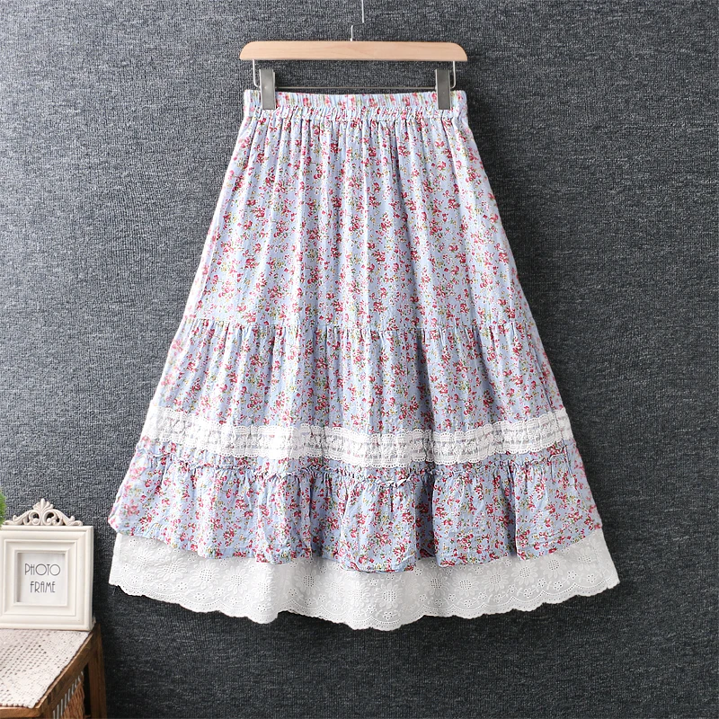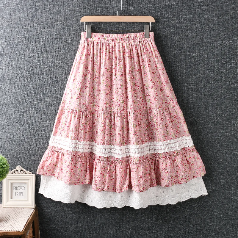 Романтическая многослойная кружевная юбка с цветочным принтом в стиле девушки Мори, милая длинная многослойная юбка с эластичным поясом saia