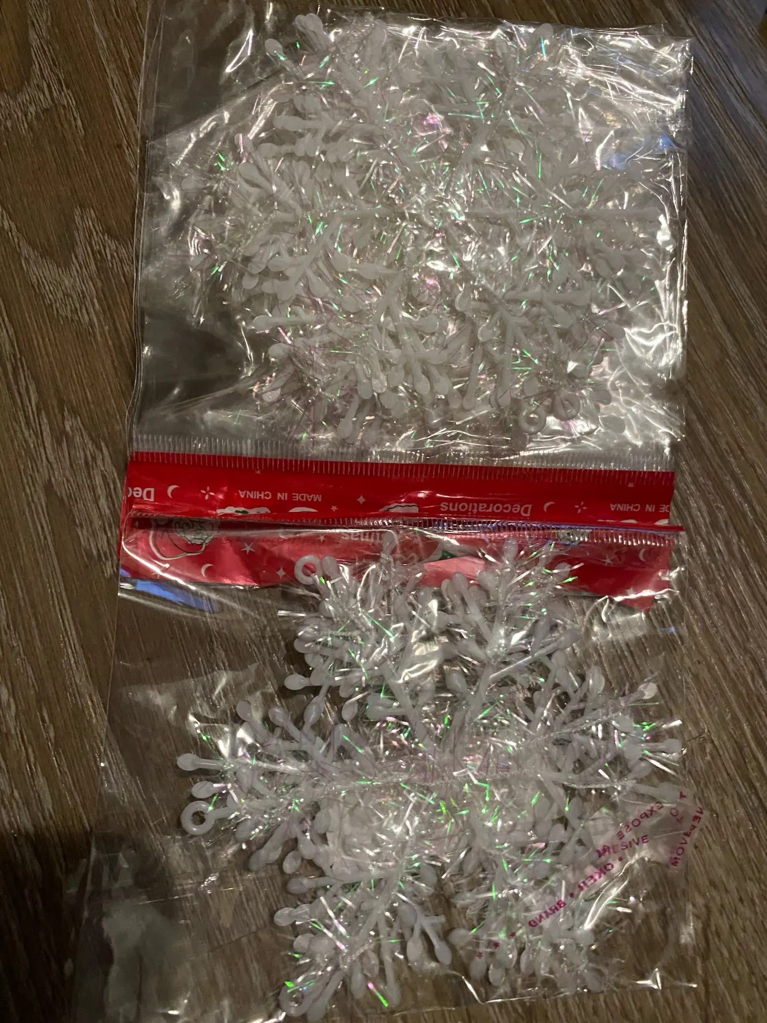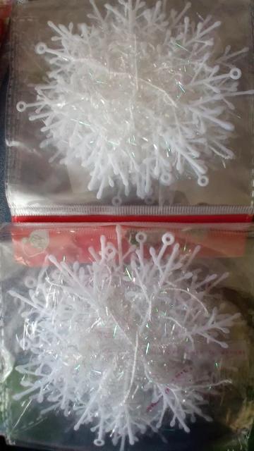 Очень красивые. Довольно тонкие, но пластик не ломается. На снежинке блестящие пёрышки. 10 пакетиков, в каждом пакетике по 3 штуки.