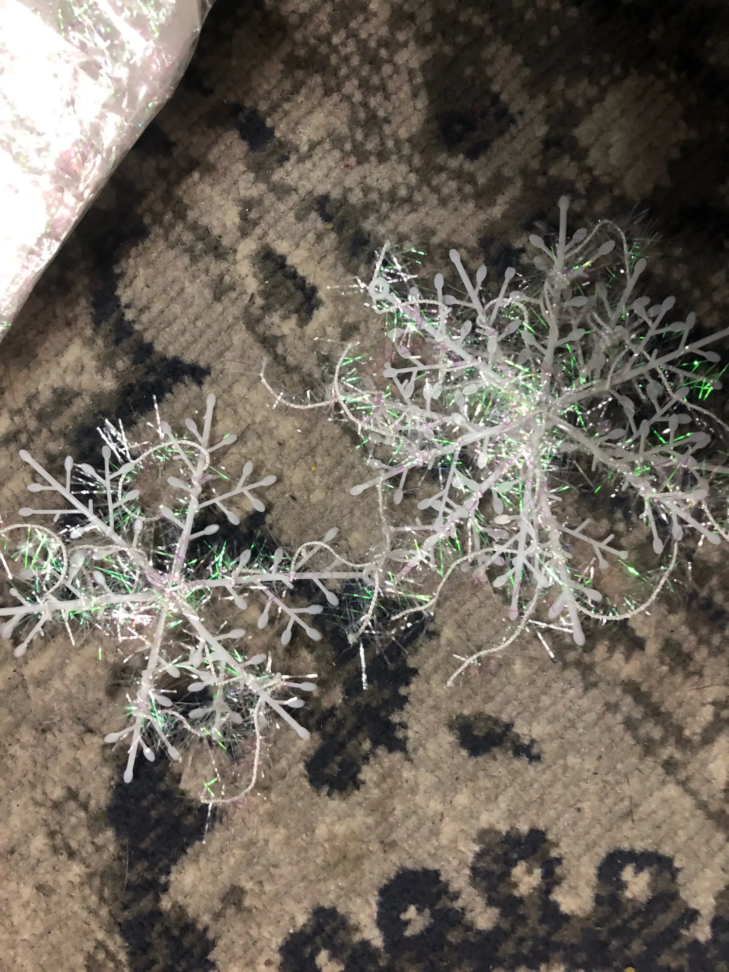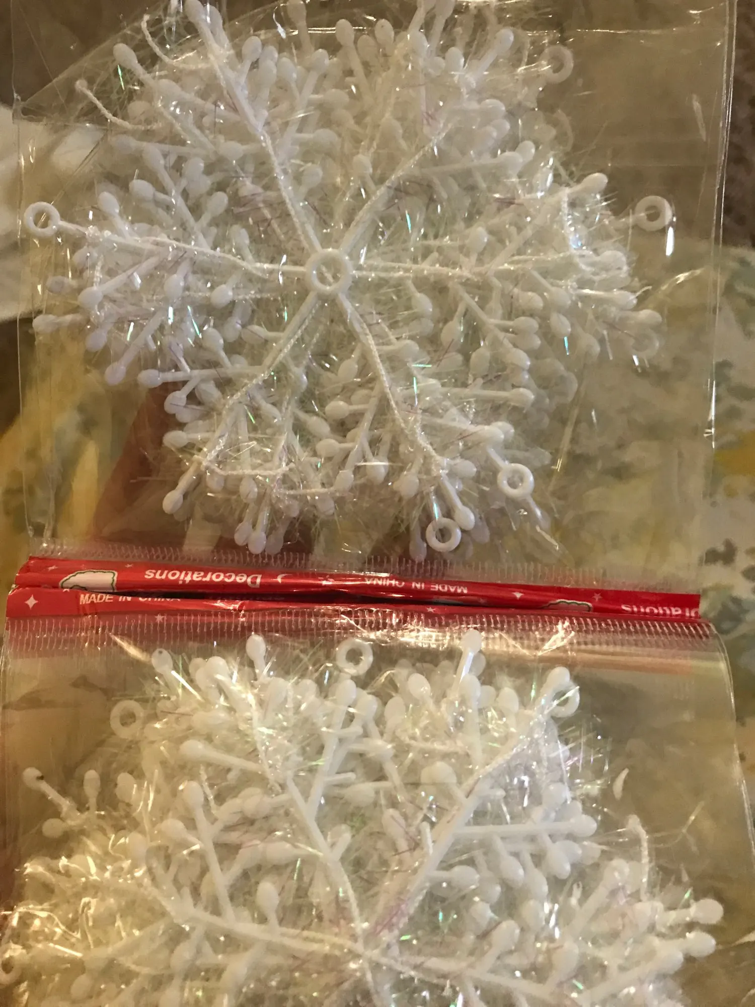 всё мятые, от пластиковой основы мишка почти везде отклеилась на концах снежинок, надо все переклеивать, выпрямить сами снежинки скорее всего не получится, будут все в кривь и кось