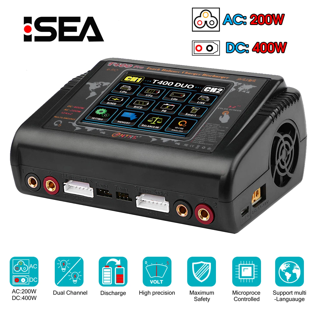 Новинка, зарядное устройство HTRC T400 Pro RC Lipo, двойное зарядное устройство постоянного тока 400 Вт AC 200 Вт 12A * 2 Dis для LiPo LiHV LiFe Lilon NiCd NiMh Pb, зарядное устройство для аккумуляторов