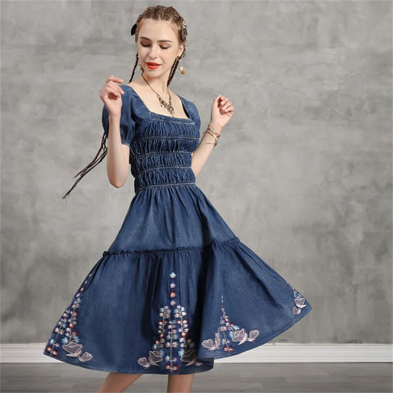 Платье женское джинсовое с квадратным вырезом, винтажное платье с коротким рукавом, с вышивкой, с эластичной талией, 2020, лето 82237