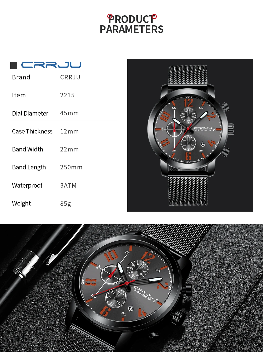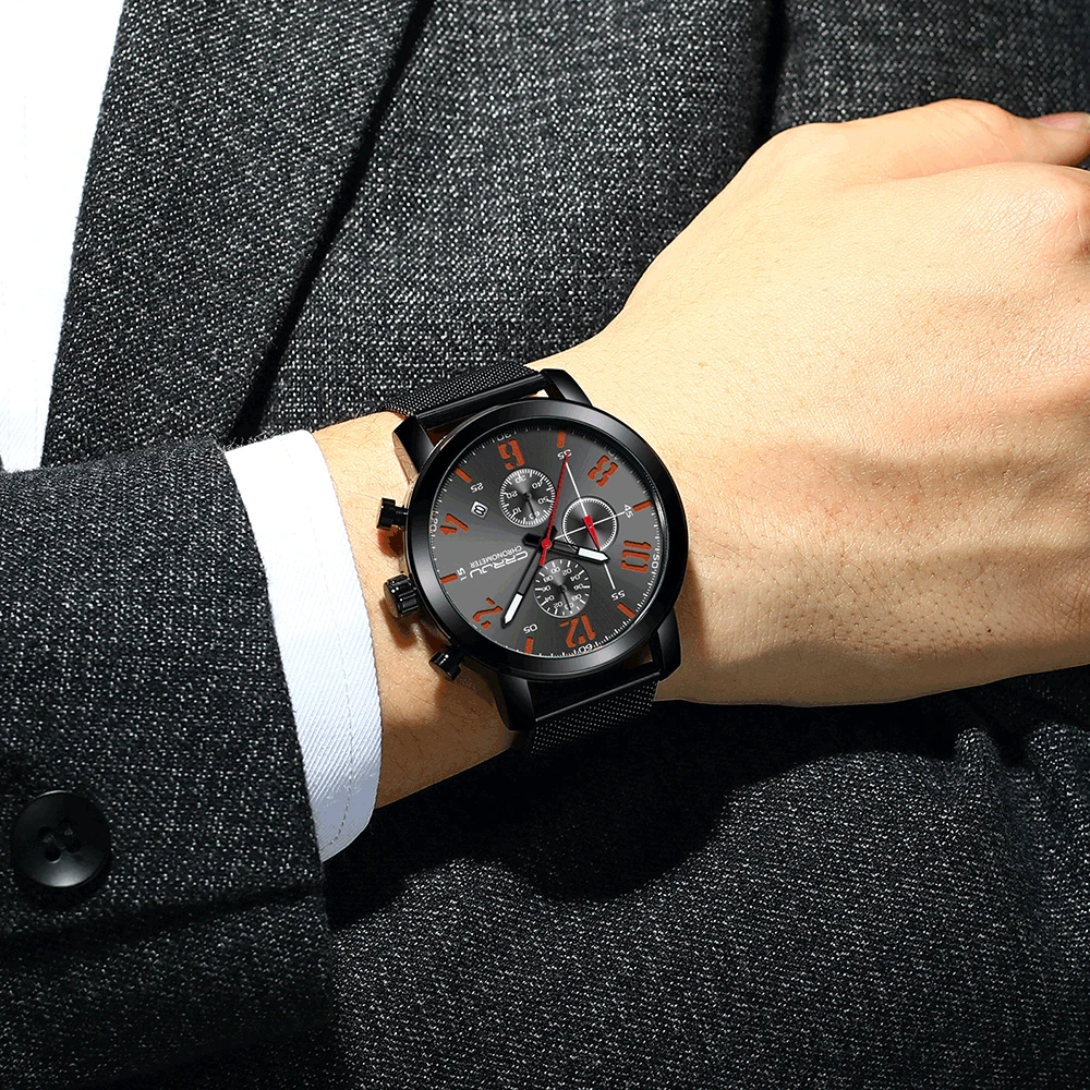 Это стильные деловые и спортивные часы, все руки работают, все маленькие циферблаты работают, с хронографом, автоматическим календарем, водонепроницаемым, светящимся; Подходит для всех случаев. Водонепроницаемость составляет 3 АТМ/30 м (поддерживает холодный душ и плавание, не эксплуатирует часы под водой, не поддерживает горячую воду)