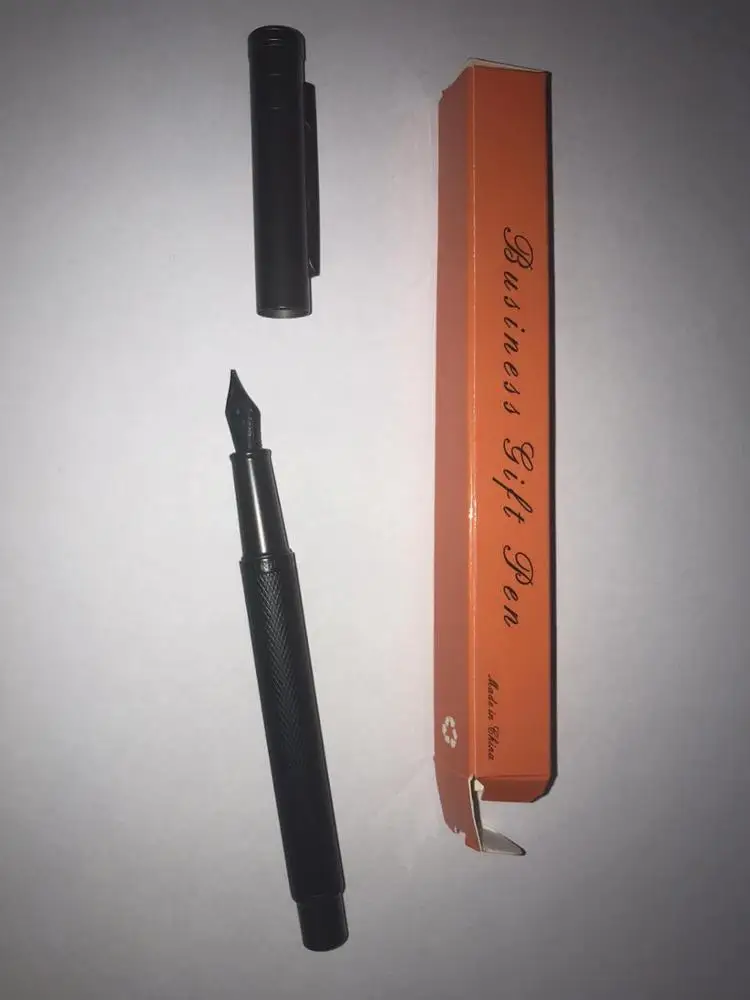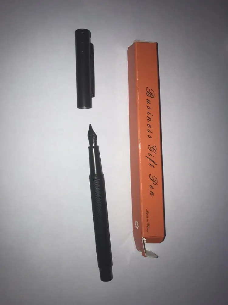 Товар точно соответствует описанию. Это красивая Минималистичная черная авторучка с изящным пером. К моему счастливому удивлению, этот наконечник немного промокает (не слишком влажный), и он скользит по бумаге так гладко.