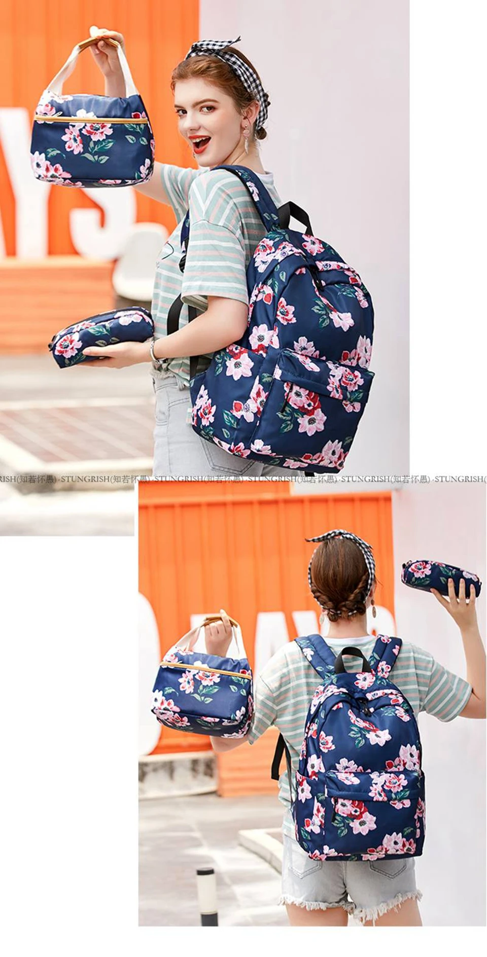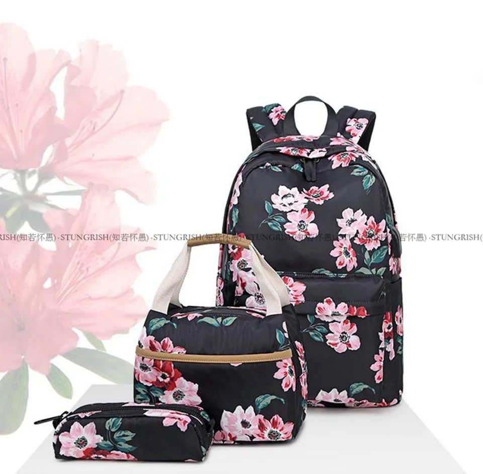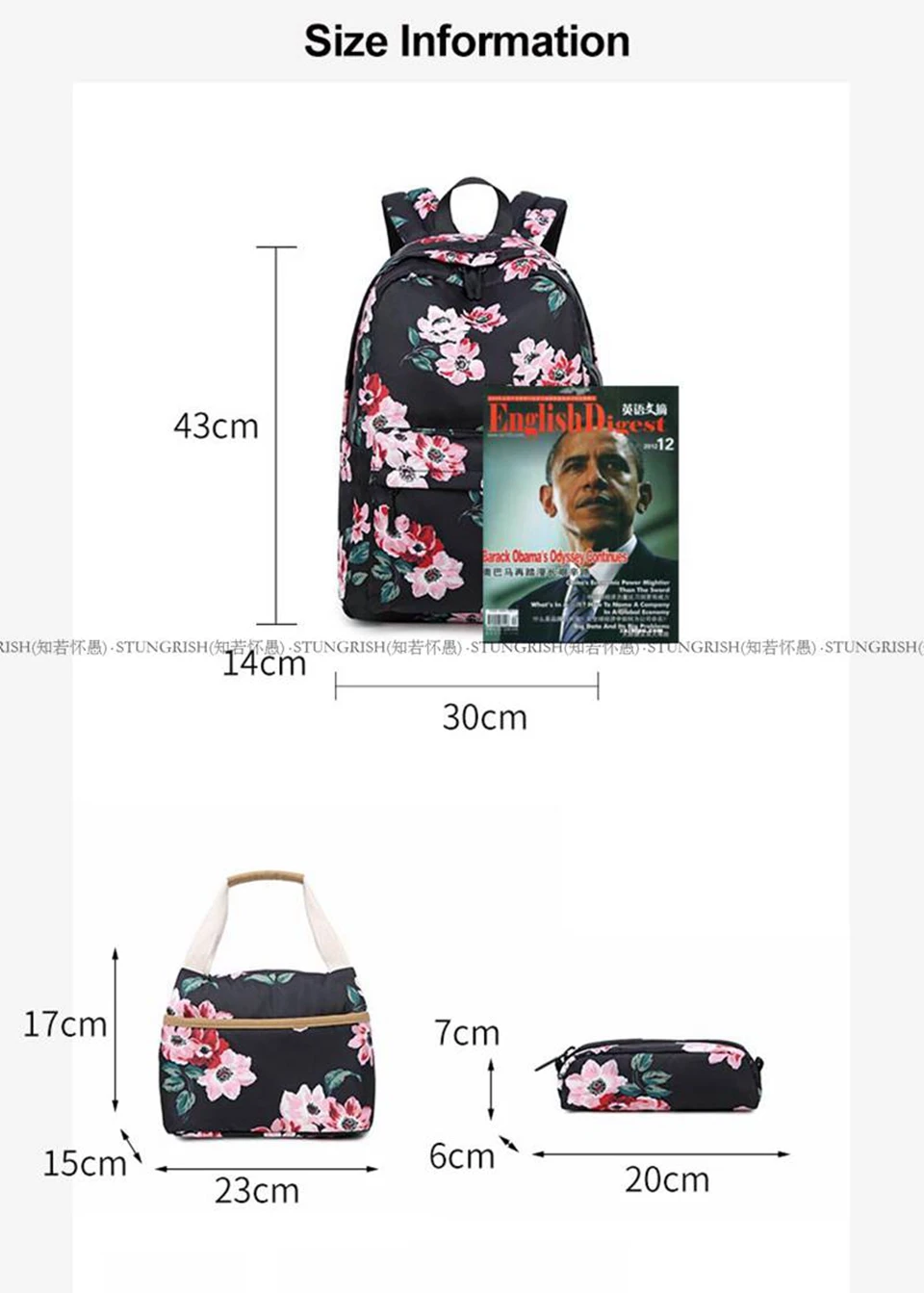 Рюкзак для девочек 3 в 1 комплект: рюкзак + Сумка-тоут + Сумка-карандаш, водонепроницаемый нейлоновый материал не рвет и не рвет, когда вы положите много внутри рюкзака, SBS гладкая молния, которая позволяет чувствовать себя хорошо и легко скользит.Школьный рюкзак для девочек-подростков: размеры 11,8 "x 5,5" x 16,9 "(Д * Ш * Г * В), Вес: 0,7 кг, может держать 14" деловая сумка для ноутбука, сумка для ланча: 9,1 "x 6,7" x 5,9 "(Д * Г * В), может поместиться 2 коробки для обеда и фруктов. Пенал: 7,9 "x 2,8" (Д * В), положите ручки или другие канцелярские принадлежности.Основной внутренний отсек может помещать ноутбуки, журналы, файлы формата А4 и так далее. Отделение для ноутбука с подкладкой, хорошо защищает ноутбук.Набор рюкзаков с цветочным рисунком можно использовать в качестве школьных сумок, повседневных рюкзаков, повседневных рюкзаков. Лямки мягкие и регулируемые, что может облегчить давление на плечо.Этот комплект школьных рюкзаков для девочек является многофункциональным, который может подойти для путешествий, кемпинга, школы, офиса, покупок, свиданий, вождения и т. д.Примечание:Поскольку размер измеряется вручную, реальный товар может немного отличаться от указанного выше размера.Из-за световых эффектов, настроек яркости/контрастности монитора и т. д. могут быть некоторые различия в цветовом тоне изображения и реального товара.Посылка:1 * Рюкзак1 * сумка для завтрака1 * пенал