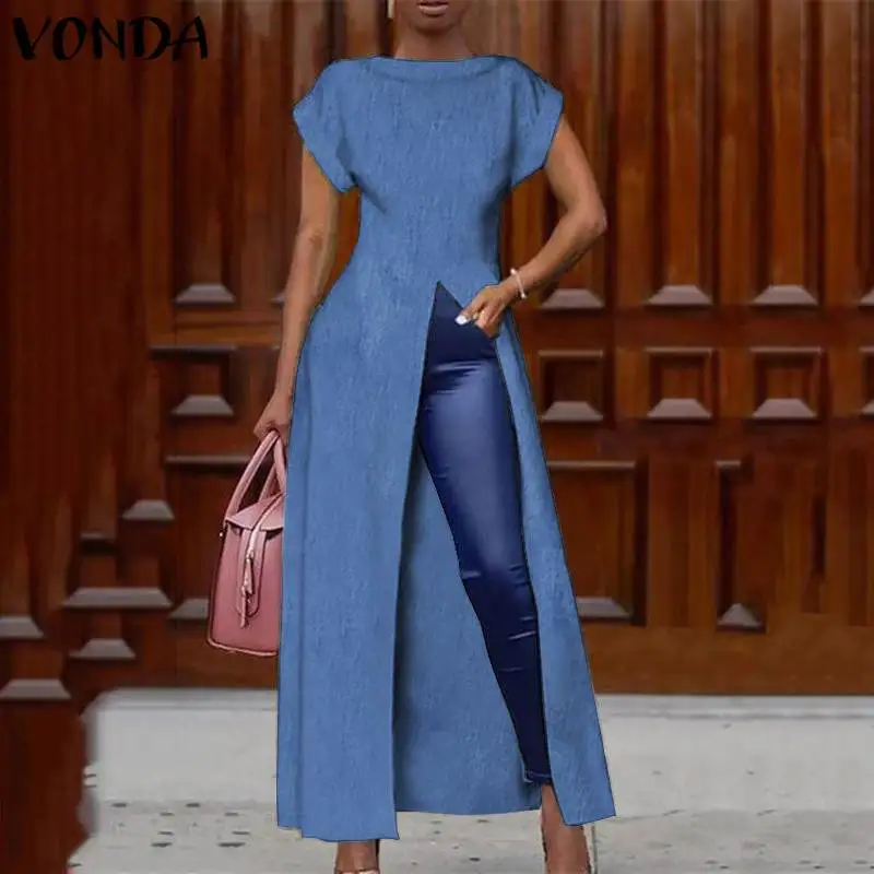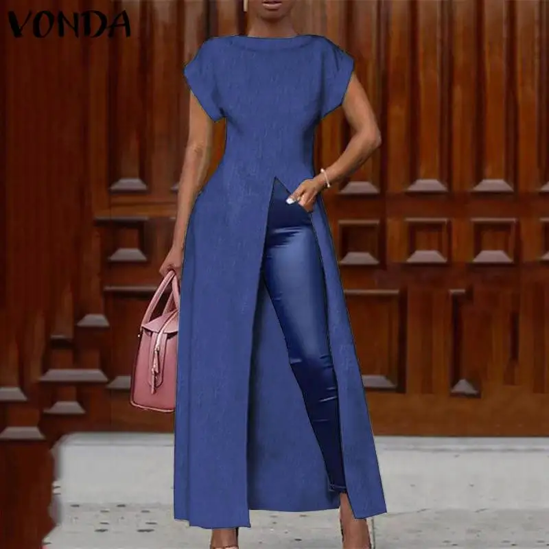 Топы VONDA, женская блузка с коротким рукавом, шорты с высоким разрезом для коктейвечерние, модная Длинная блузка, Джинсовая туника, рубашки, блузы
