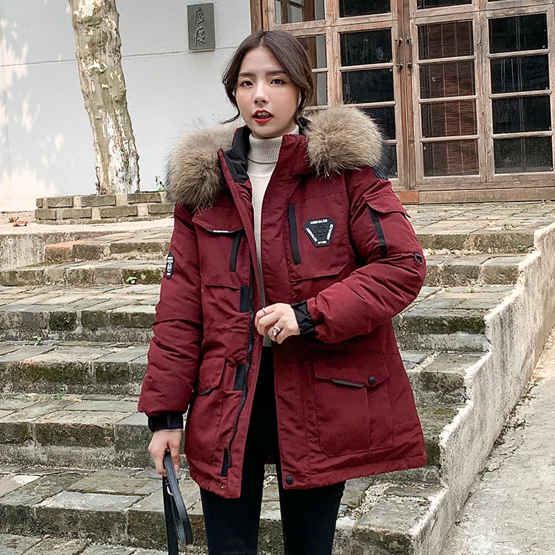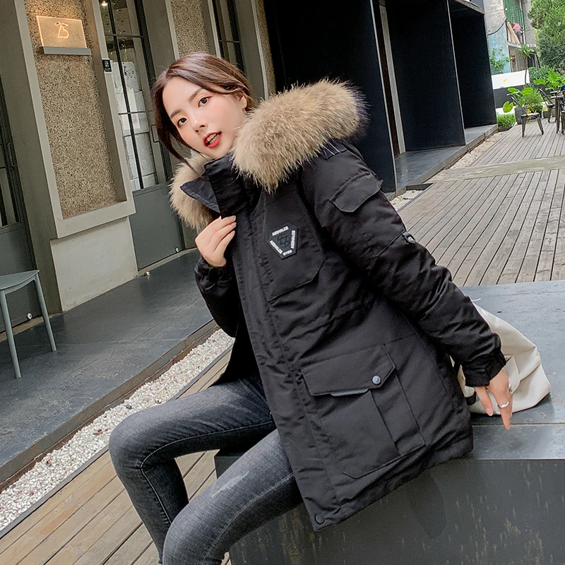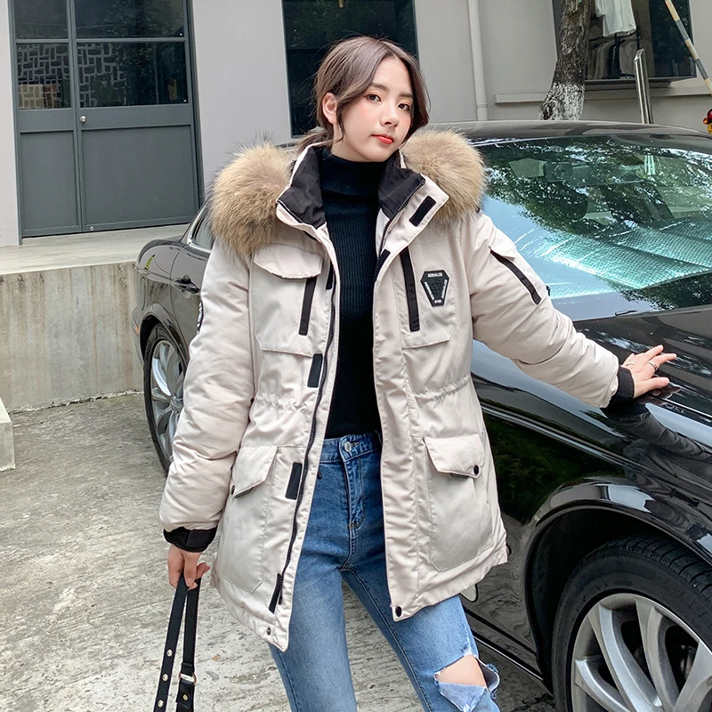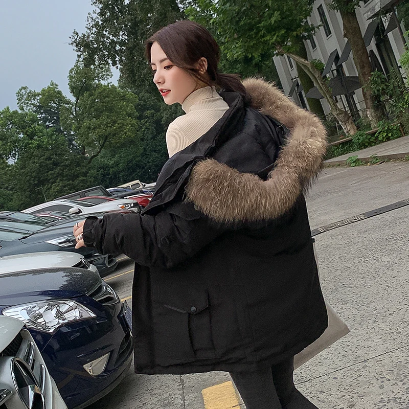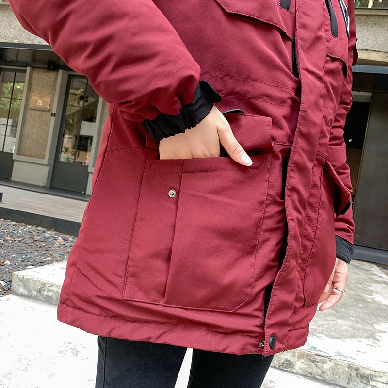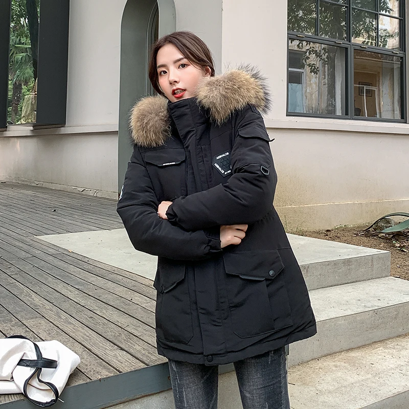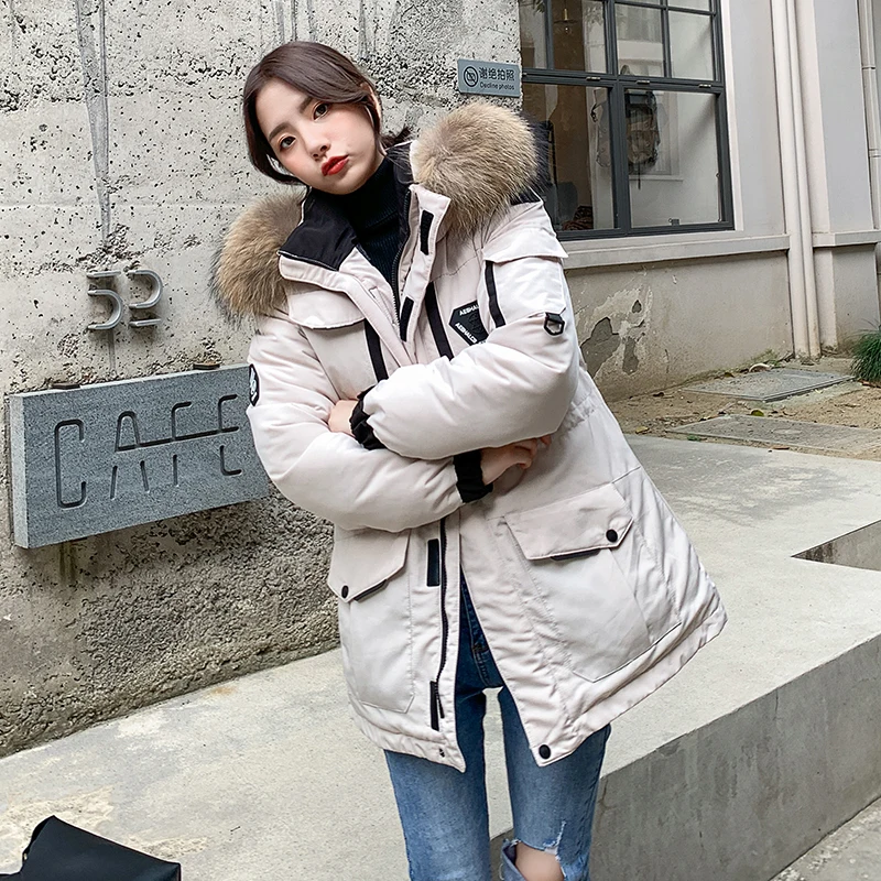 Женские Длинные парки в Корейском стиле, зимняя куртка с капюшоном, плотное хлопковое пальто с меховым воротником и узором, женская одежда
