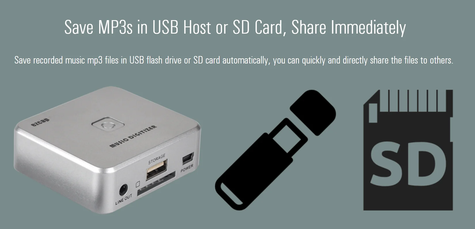 С ezcap241 музыкальный дигитайзер, вы можете легко конвертировать свою старую аналоговую музыку в MP3, а также сохранить в usb-накопитель или sd-карту без компьютера, и он может автоматически разделять все песни из всей музыки.