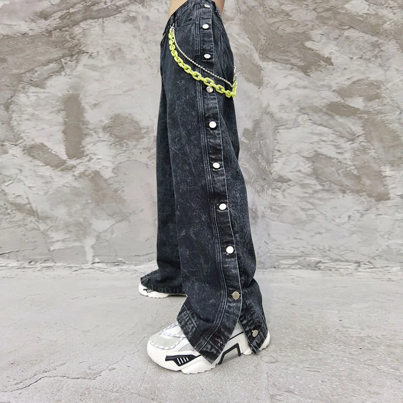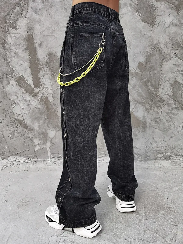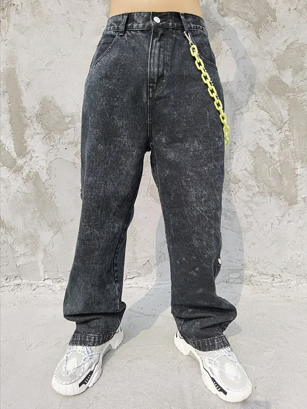 Для мужчин боковые кнопки вытертые Винтаж уличная одежда в стиле хип-хоп, свободные прямые джинсовые брюки мужские джинсовые брюки