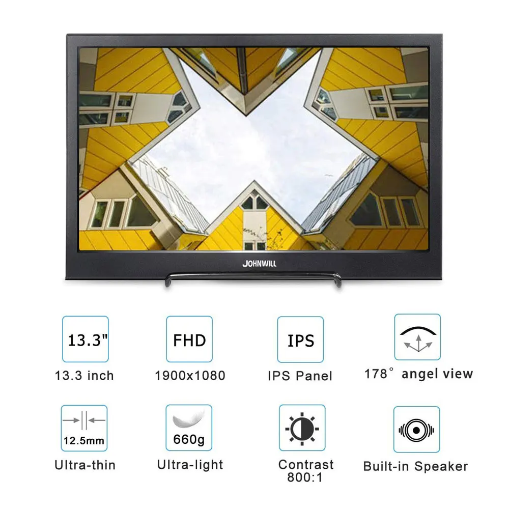Его можно использовать на PS3,PS4,Xbox360,wiiu switch, идеально подходит для игр. Он также может быть использован в качестве второго монитора компьютера, копирования и расширенного экрана и так далее. Его легко поддерживать кобура. Чехол-Дисплей изготовлен из металла. Разъем для наушников доступны 13,3 дюйма вес данного проекта заключается в том, 0,685 кг/1,7 фунтов Вес нетто. 13,3 дюйма вес данного проекта заключается в том, 0,935 кг/2,06 Фунтов вес нетто.
