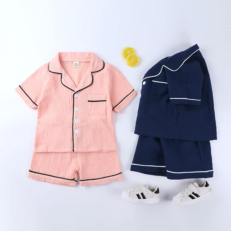 Детские пижамные комплекты для мальчиков и девочек, От 3 до 8 лет, чистый цвет, комплект одежды из хлопка и льна, блуза с короткими рукавами топы + шорты, одежда для сна, пижама