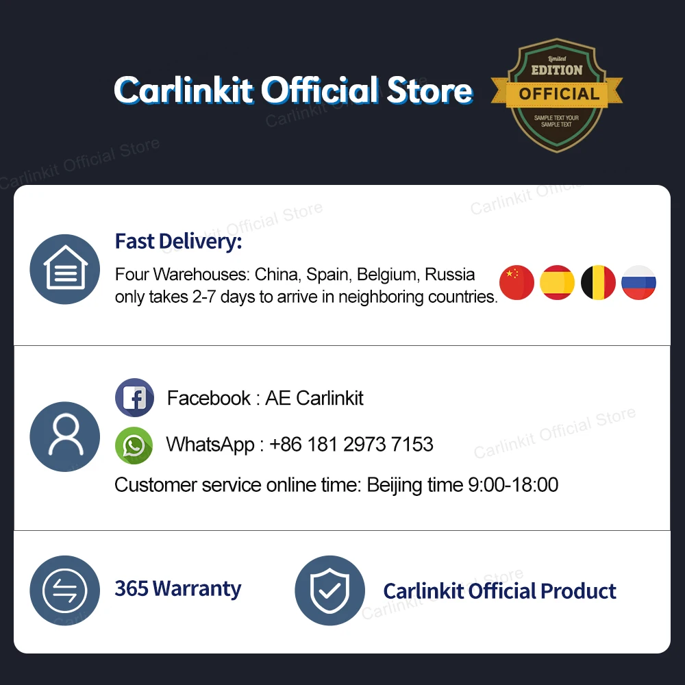 1. 【Адаптация 】 после размещения заказа, служба поддержки клиентов подтвердит пригодность вашего автомобиля перед отправкой.2. [Логистика] есть склады в Китае, Бельгии, Испании и России:【Europe】 2-7 дней, чтобы прибыть, 【Asia】 5-15 дней, 【африка, океан 】 10-30 дней, 【южная Америка, Северная Америка 】 10-40 дней.3. 【 послепродажное обслуживание 】 WhatsApp: + 86 181 2973 7153, Facebook: AE Carlinkit.4. 【Гарантия 】один год