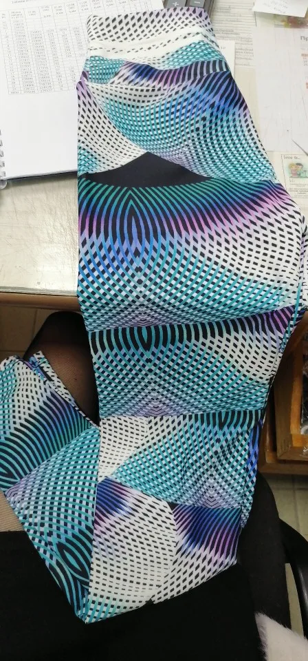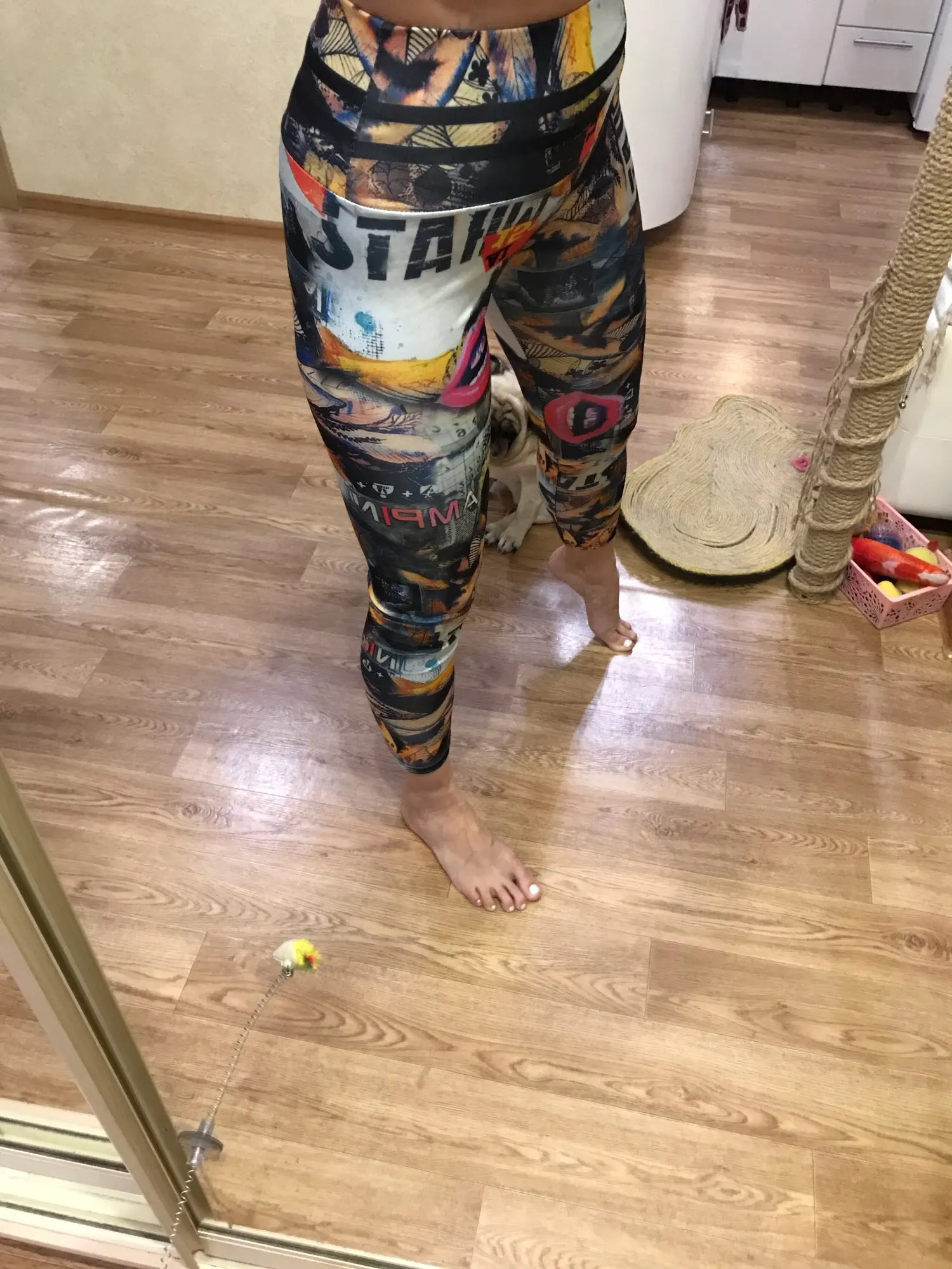 Снизила звезду за раскрой и швы. При натяжении видно нитки поперёк шва (некрасиво), я прострочу ещё обычным швом, думаю это исправит ситуацию. Там где надо подгонять рисунок его не подгоняют, а где не надо... Прямо на причинном месте надо же так совпало или у меня диагноз по Фрейду. Думаю носить ли в зал или для дома оставить, чтобы не шокировать публику))). Ткань отличная, приятная, плотная(не просвечивает), хорошо тянется, внутри вставлена широкая резинка сантиметра 3, не сползают. На рост 165 см длинновато, лишних 3 см. Размер брала по таблице продавца XL, сели плотно, но не сильно в обтяжку, то, что и хотела. В талии хорошо, боялась, что в талии будут большие, но тоже сели плотно, но не туго. Талия у меня 70см, бёдра 98 см.