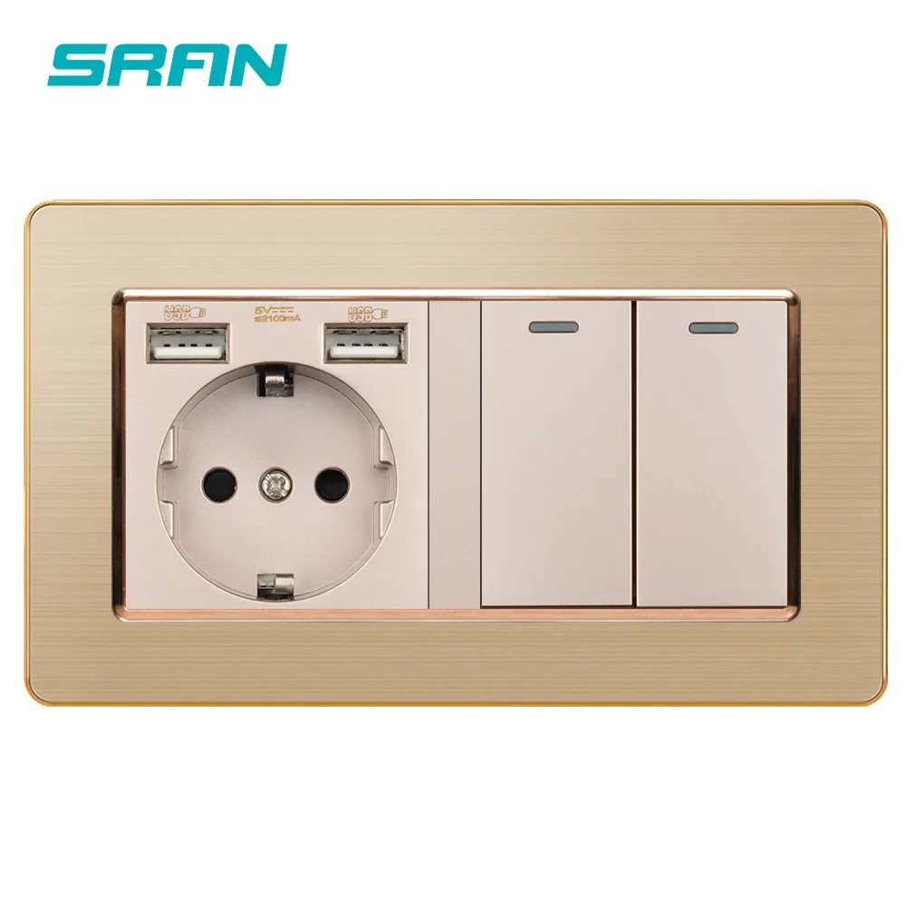 Европейская розетка SRAN с переключателем, 220 В, 16 А, настенная розетка с usb 146*86, панель из нержавеющей стали с выключателем света, 2 комплекта, 123