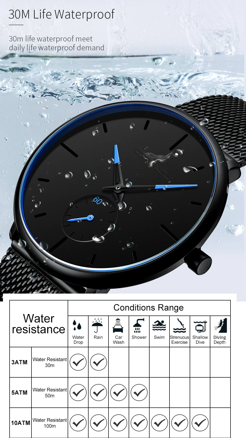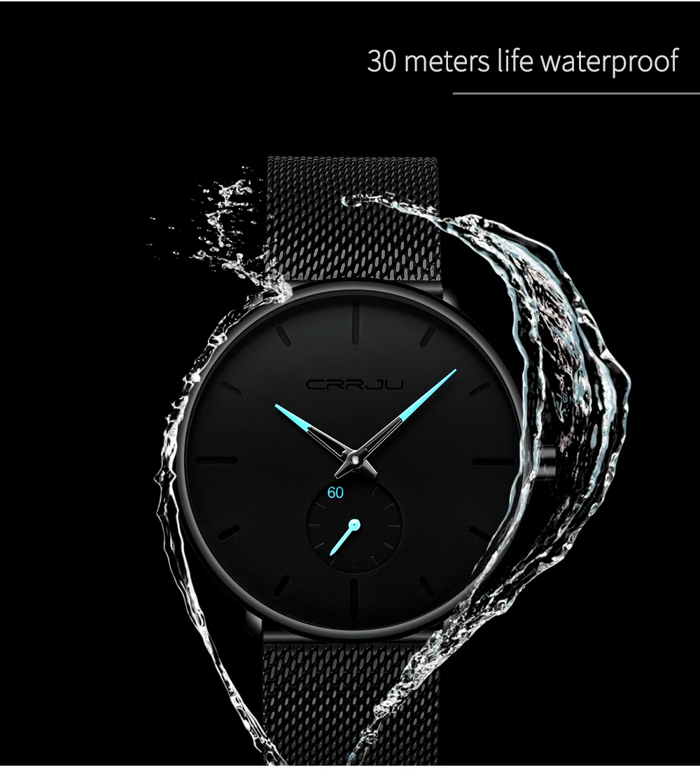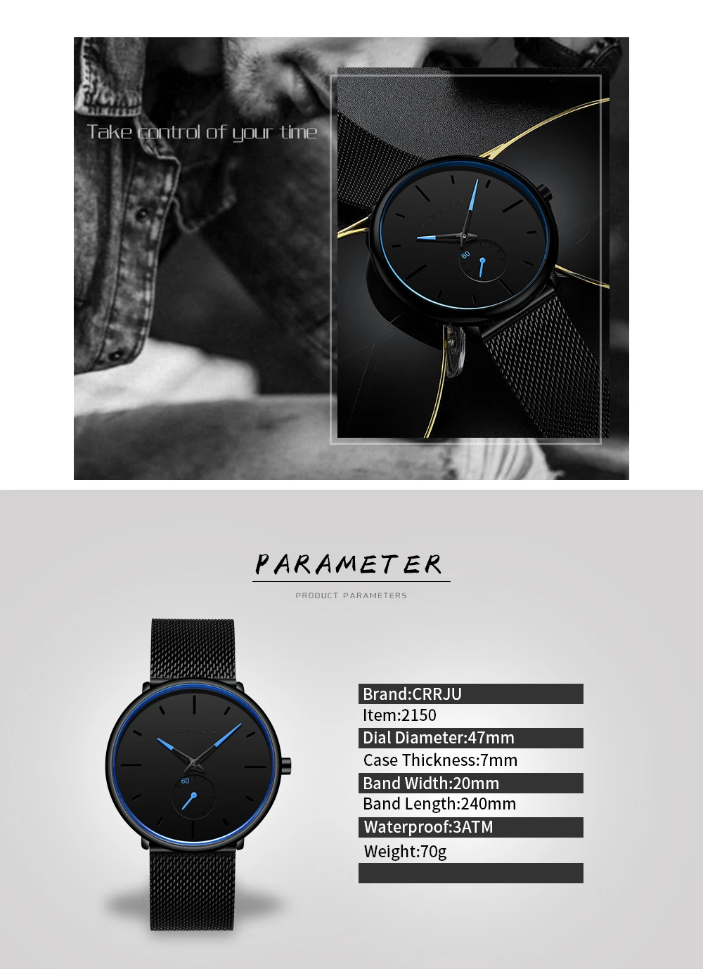 Мужские минималистичные часы CRRJU, ультратонкие, 2020 водонепроницаемые, кварцевый секундомер
