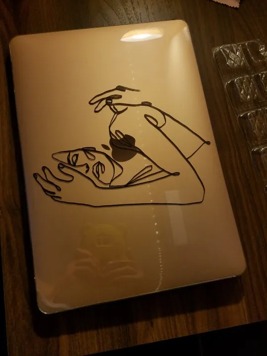 Чехол красивый и очень подходит для размера компьютера и его качество очень хорошее, но бракованный, что линия рисования шелушивается большим количеством движения и использует крышку, также нравится то, что я смотрите на рисунке очистку трудно и состоит из белых пятен, когда пытаемся очистить.