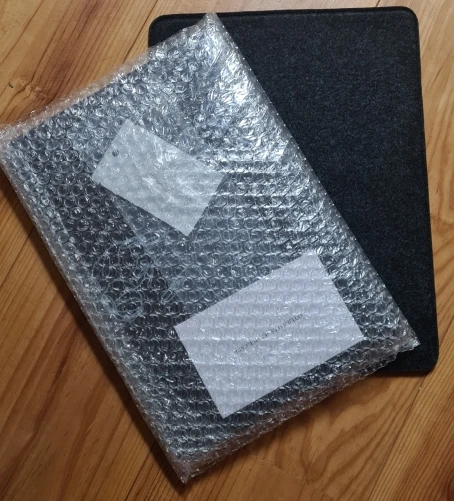 Чехол пришёл хорошо упакован. Он матовый, что для меня было сюрпризом, но следов на нем не остаётся. Накладка для клавиатуры прозрачно-матовая что не совсем приятно. Мне больше нравится без неё, Клавиатура с ней становится блеклой и печатать в темноте не очень удобно, но свет от букв она не перекрывает. В тканевый чехол мак помещается вместе с чехлом.