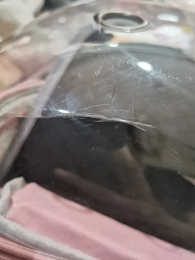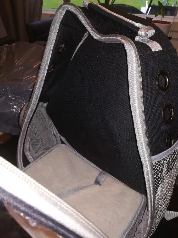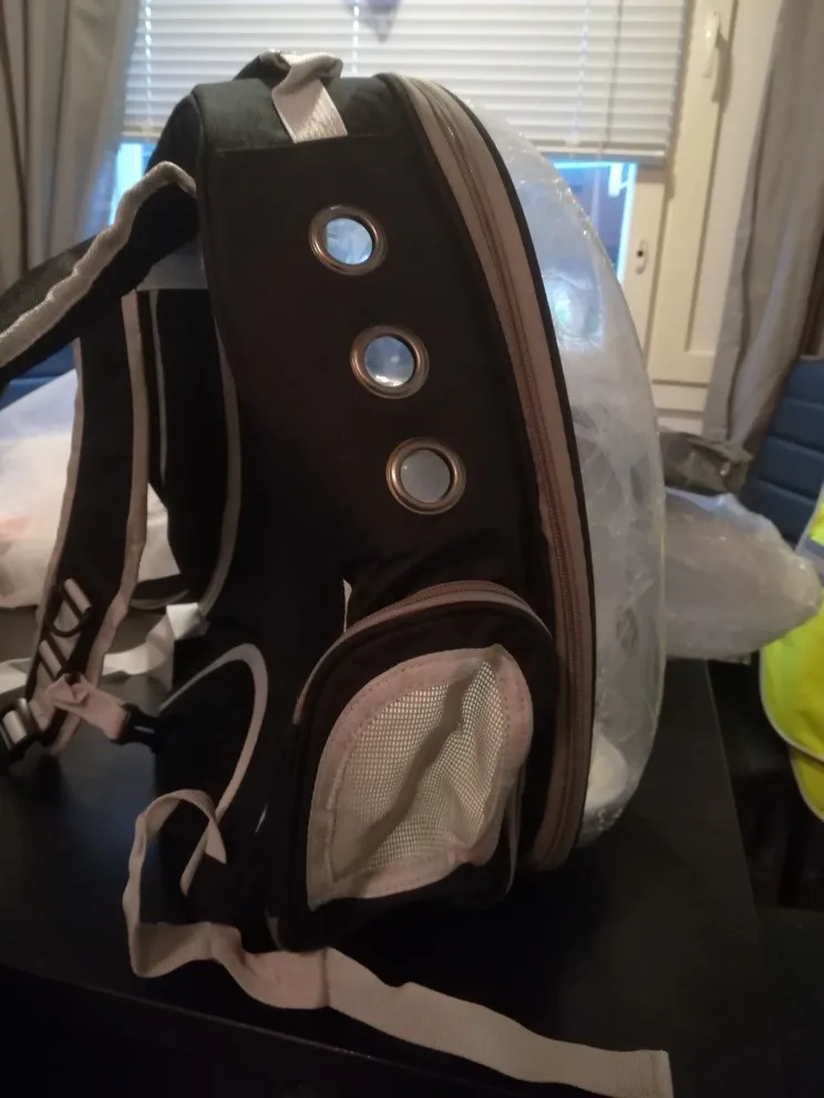 Идеально упаковано и доставлено без несоответствия. Прозрачный пластик имеет защитную пленку, чтобы не царапать. Хороший материал, идеальные молнии и небольшой запах. Он имеет внутренний коврик с крючком для ожерелья и боковой мешок с внутренним доступом. Моя кошка хорошо сидит и в восторге от рюкзака. Отличная покупка!