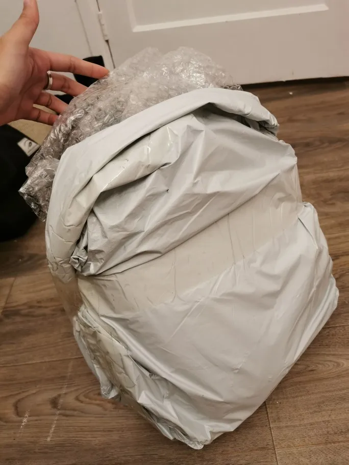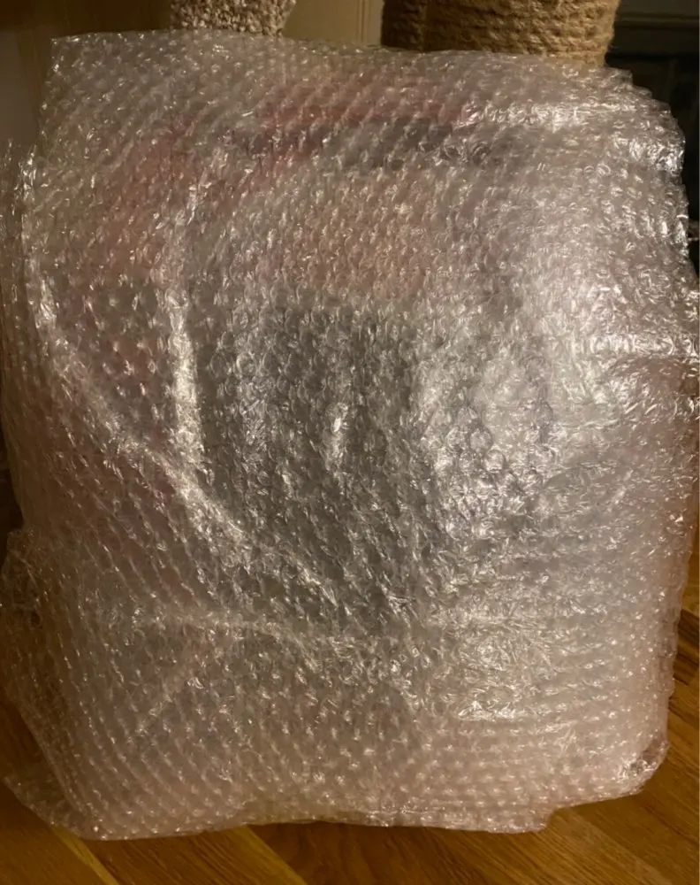 Пришел довольно помятый, но целый, хотя упакован был только В пупырку и пакет. А так норм) кот поместился)