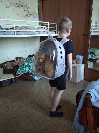 Рюкзак шёл 2 месяца. И в этот раз , как ни странно, виновата не наша почта. Рюкзак пришёл с вдавленным корпусом (тоже спасибо почте). После выравнивания остались незначительные дефекты на пластике. Трудно было отодрать пленку от пластика- замок нашит на плёнку. А так всё как в описании. кошка (около 4 кг) поместилась . Она в шоке