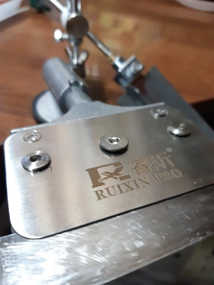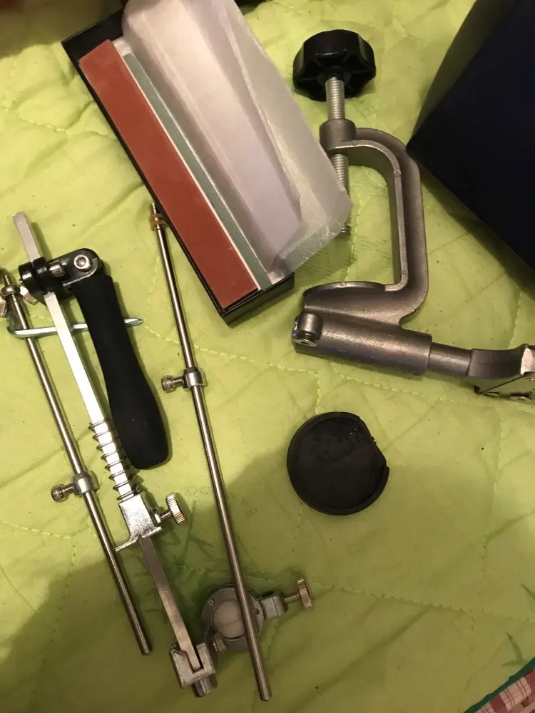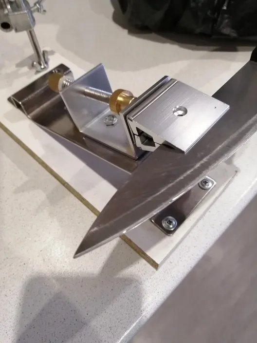 Хрень конечно. 1) Пластина очень тонкая, в процессе заточки она гнется и соответственно угол меняется. Пришлось изготовить другую из 5мм стали. 2) клешни которые держат нож, фиксация мелким винтом с шестигранником это пиздец. Заменил на более длинный и под отвёртку. Дополнительно рассверлил под больший диаметр. 3) точить короткие ножи можно только если заменить эту пластинку на одну клешню. Тогда можно поворачивать короткий нож. Ну и по мелочи всякие шайбочки поменять. Ещё в комплекте всякие болтики и квадратные гайки шли. Вообще не понятно для чего. Короче это говно не стоит 2000. Максимум 700₽. Брать или нет, на ваше усмотрение. Переделывать придется это факт. Кстати мин угол заточки около 14*. Ниже уже цепляет клешни. Но зависит от ножа. Если он широкий то можно ещё меньше угол заточить.