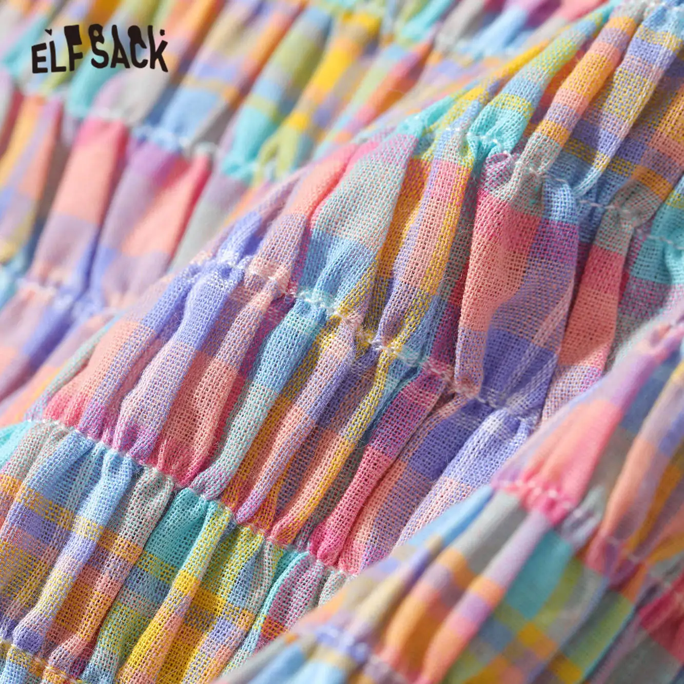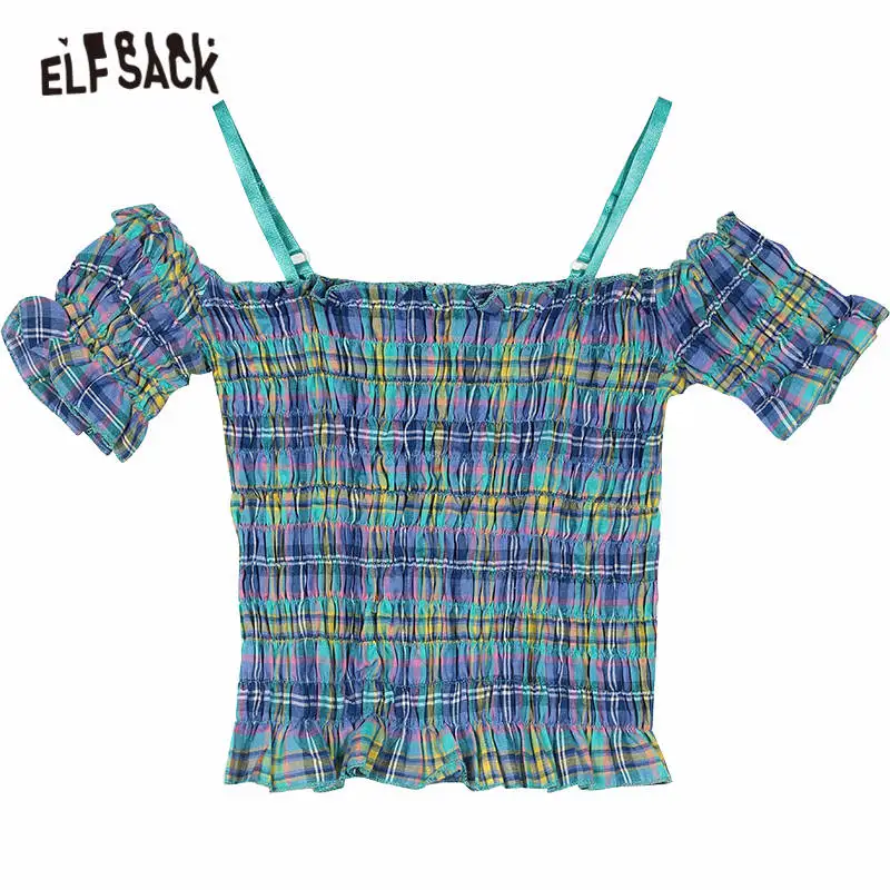 Женская винтажная клетчатая рубашка ELFSACK, розовая или синяя Повседневная рубашка с открытыми плечами в британском стиле, лето 2020