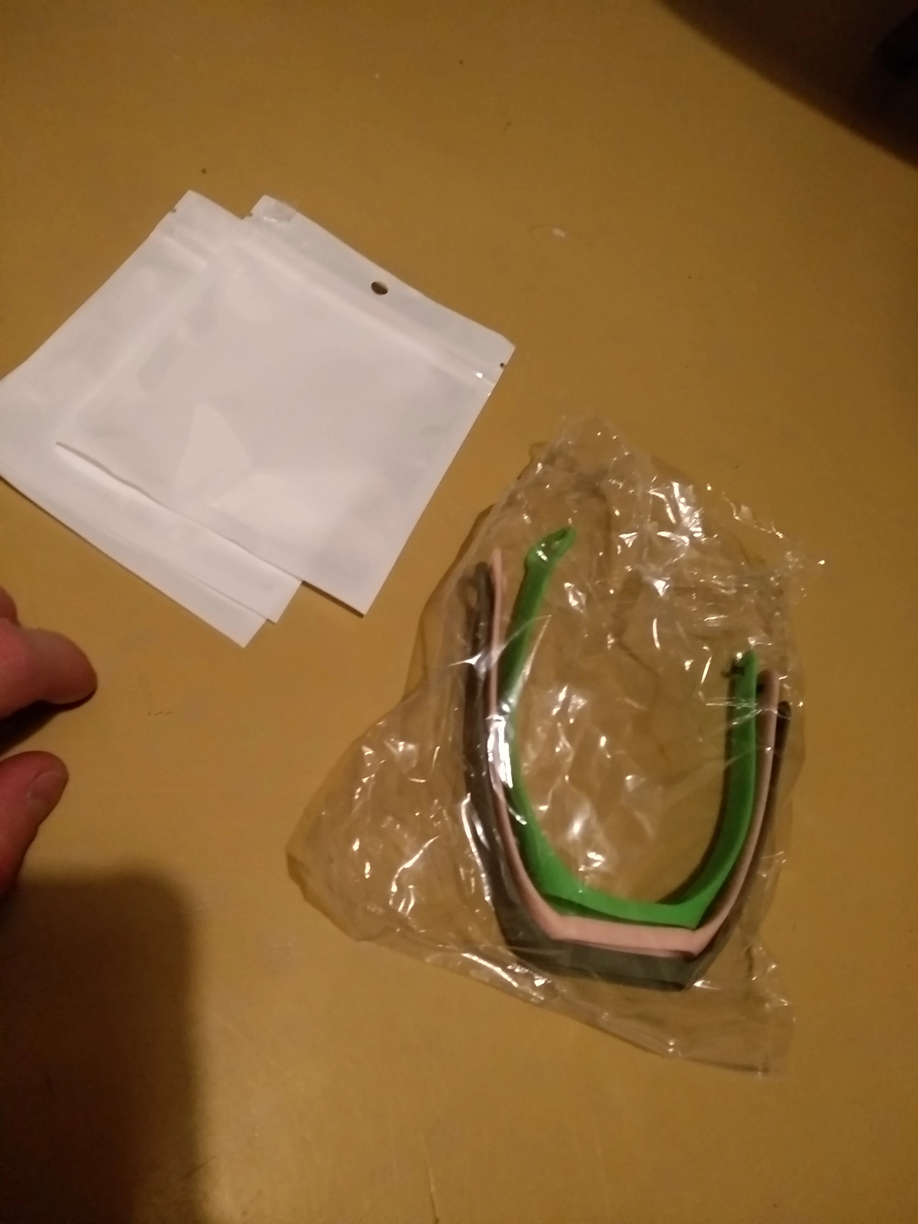 пришло в пакетике. дополнительно обложено зачем-то пустыми белыми пакетиками. в одном лежат 2 запасные пуговки-застёжки(не знаю как они правильно называются, сфоткал их тоже). качество не впечатляет. думаю, что каждого ремешка на 3-4 месяца хватит.