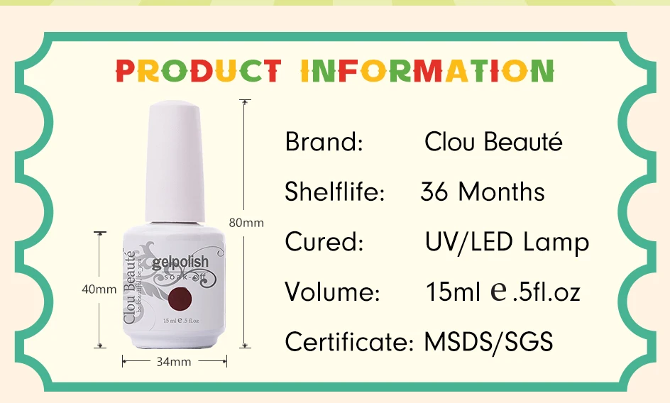 Описание продукта: Название продукта: Гвоздь Красоты Тип продукта: гель лак для ногтей Содержание: 15 мл Сертификат: в соответствии со стандартами SGS/сертификат безопасности материала (MSDS