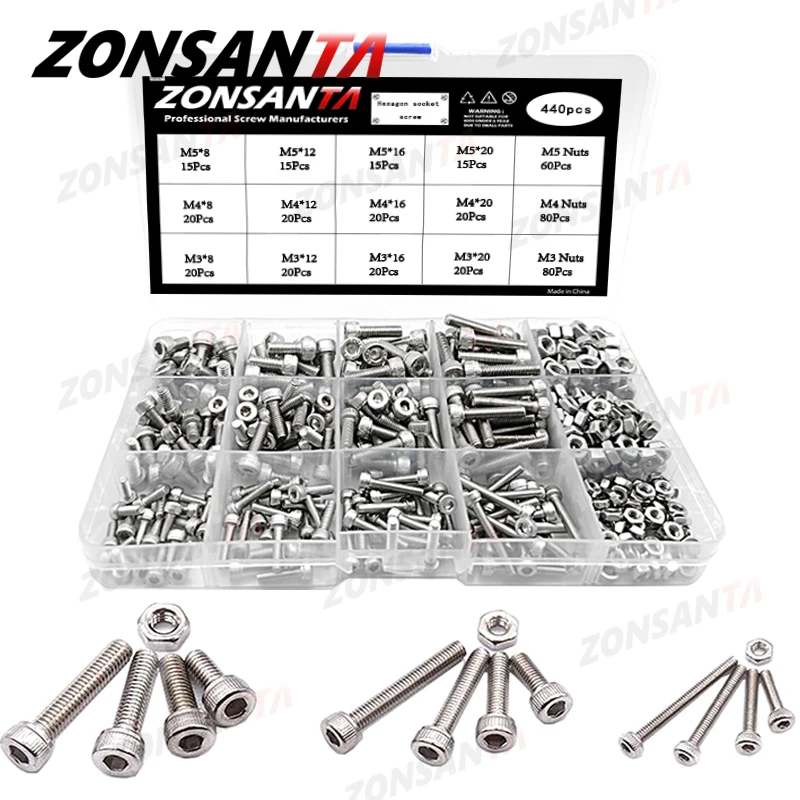 Набор винтов с шестигранной головкой, M3, M4, M5, 440, из нержавеющей стали, 304 шт.