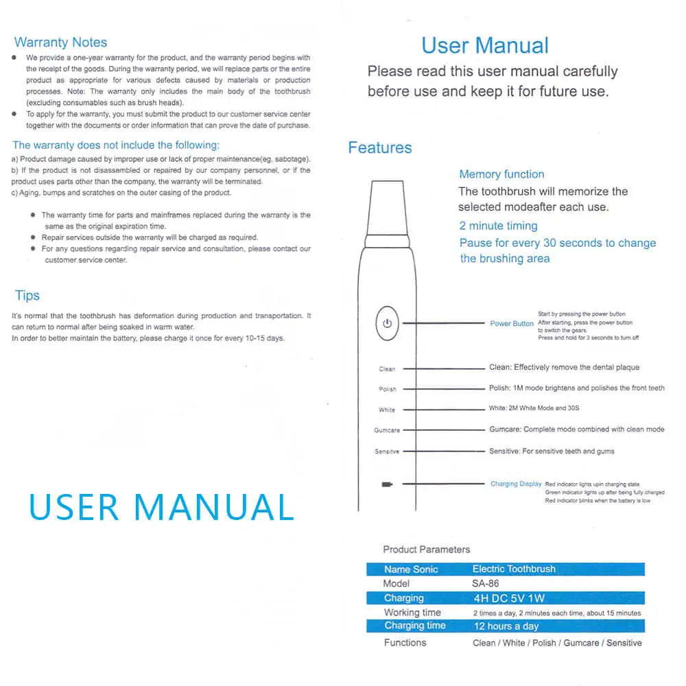 【 1 】 мощная очистка до 41000 ударов в минуту 【 2 】 3 часа зарядки для MINIUM 15 дней использования 【 3 】 мягко и эффективно достигает глубины между зубами и вдоль линии 【 4 】 2 минуты автоматический таймер, 30-секундные интервалы для обеспечения чистоты в четырех квадрантах 【 5 】 IPX-7 водонепроницаемый для использования в ванной и душе 【 6 】 длинная батарея Ilife, поддерживается зарядкой через USB, безопасная и Легкая Автоматическая отключка после полной зарядки, совместима с любым источником питания 【 7 】 зубные щетинки сделаны из нейлона Dupont, подходят для топографии зубов для очистки десен и труднодоступных областей Материал: ABS / TPE / DuPont нейлоновая щетина Режим зарядки: 5 В-USB зарядка Напряжение: 3,7 В Мощность: 0,5 Вт