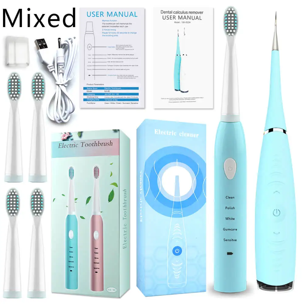 Посылка включает: Электрическая зубная щетка-1 шт. 1 х Электрический аппарат для снятия калькулятор 4 x Оригинальная головка щетки 1 x Руководство пользователя для зубной щетки 1 х Руководство пользователя для удаления 2 x USB кабель для зарядки Пылезащитный чехол для зубной щетки-1 шт. 2 x без коробки