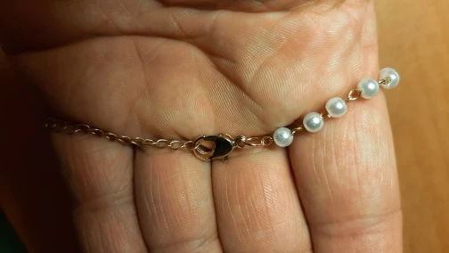 хорошая цепочка, выглядит немного хрупкой, на деле отличная. длину можно регулировать. замочек надежный, думаю, не откроется сам. сами жемчужинки красивые и круглые, все одинаковое формы и цвет один. вполне неплохо для такой цены.