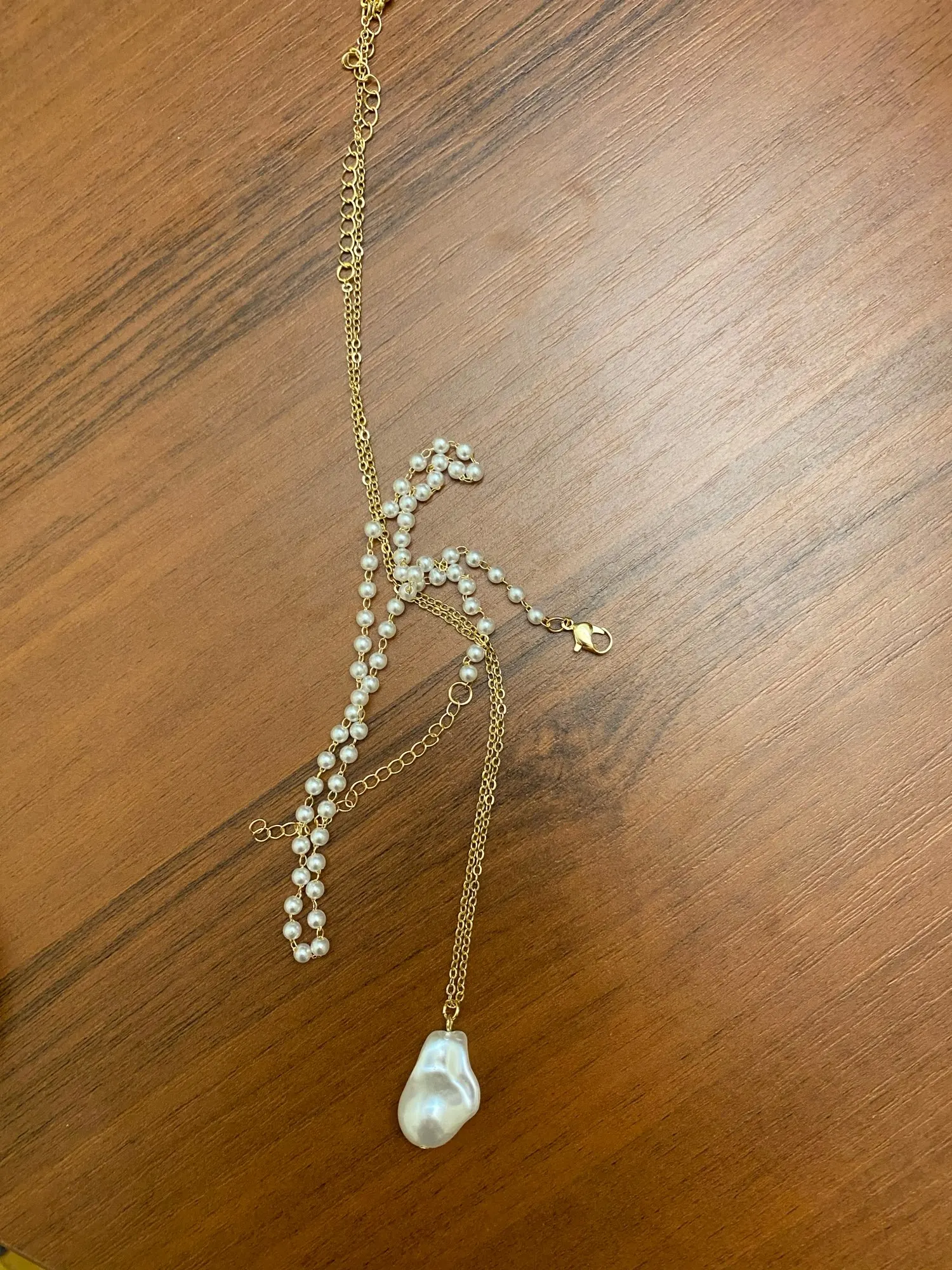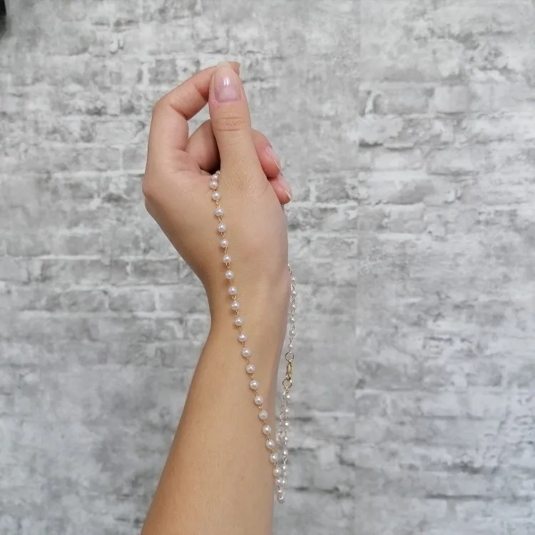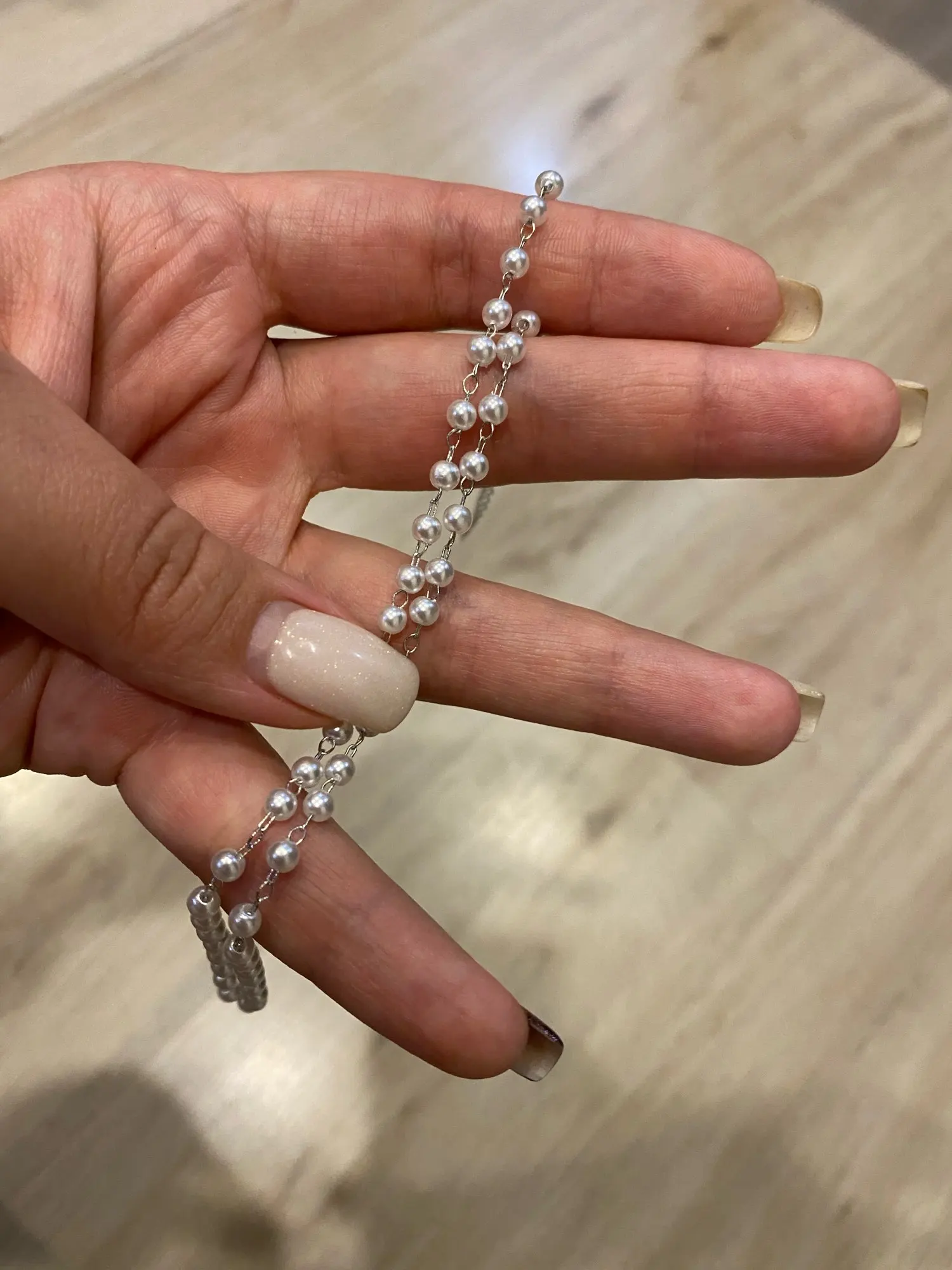Отправили посылку быстро, долго лежала на таможне. Красивая бижутерия. Сейчас достаточно модно носить подобные украшения. Сделано все аккуратно. Смотрится очень даже симпатично. Бусины белые, с серым отливом, цепь под серебро.