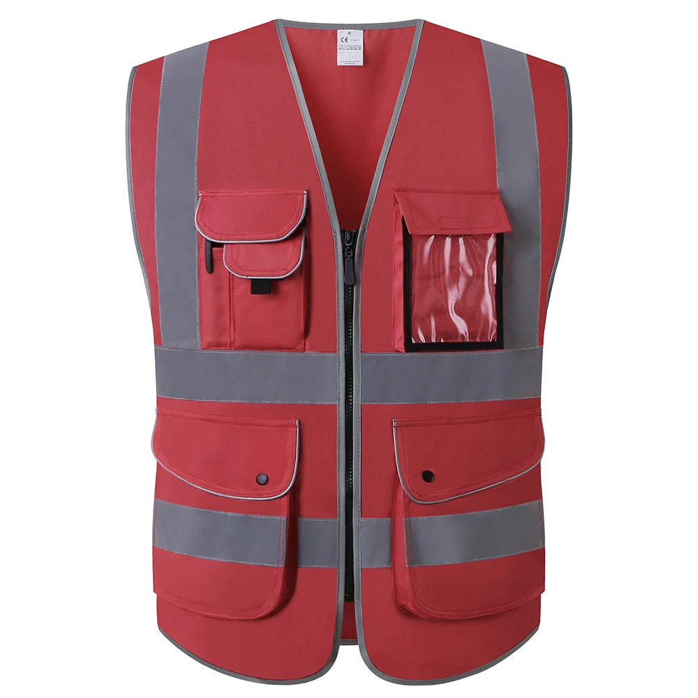 Светоотражающий жилет с 9 карманами, высокая видимость, красный Рабочий жилет на молнии для мужчин и женщин