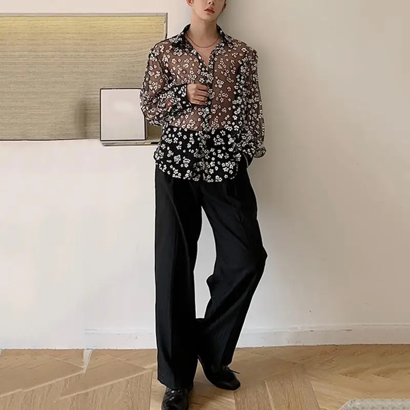 Мужская сетчатая Модная рубашка с длинным рукавом, Черные блузы с принтом, Повседневная Свободная блузка, уличная одежда, топы с отворотами для вечевечерние и клубов