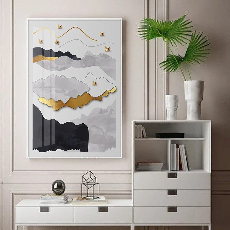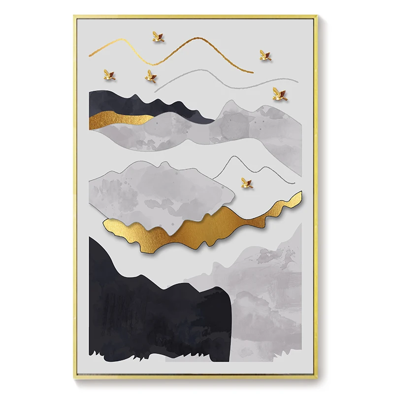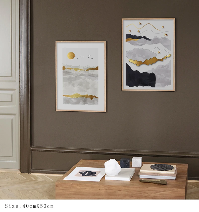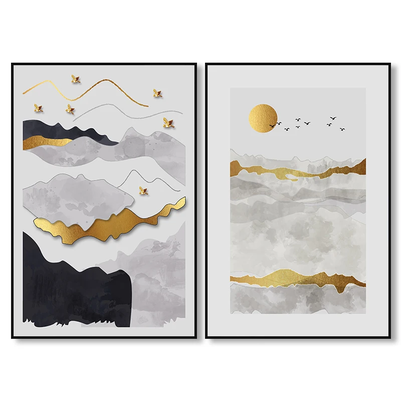 Скандинавский декор, холст, живопись, абстрактный Горный пейзаж, Постер, принт, золото, солнце, птицы, Настенная картина, декор для спальни